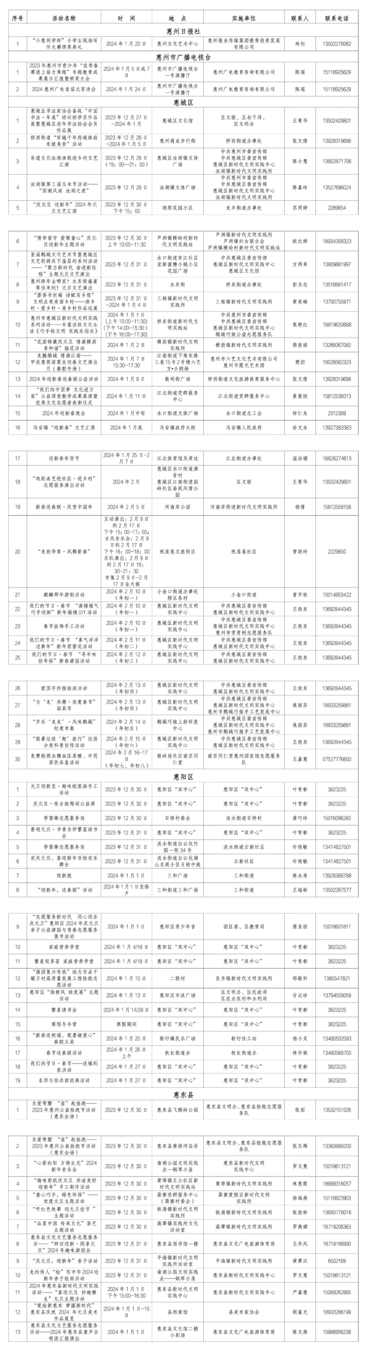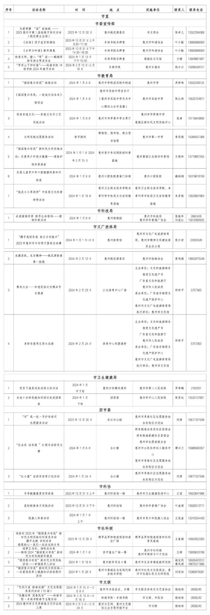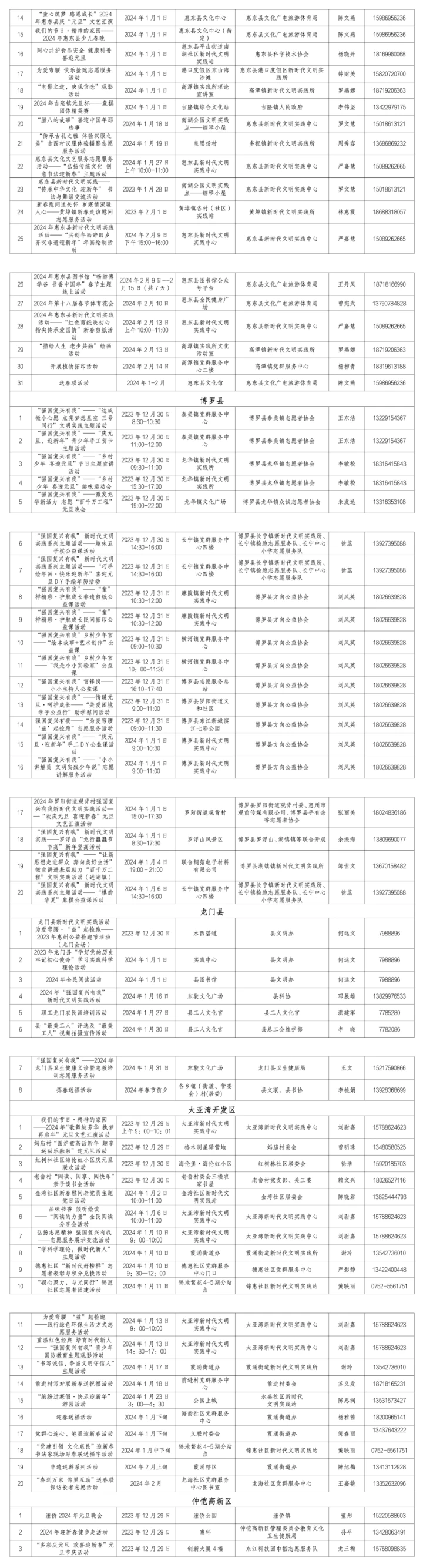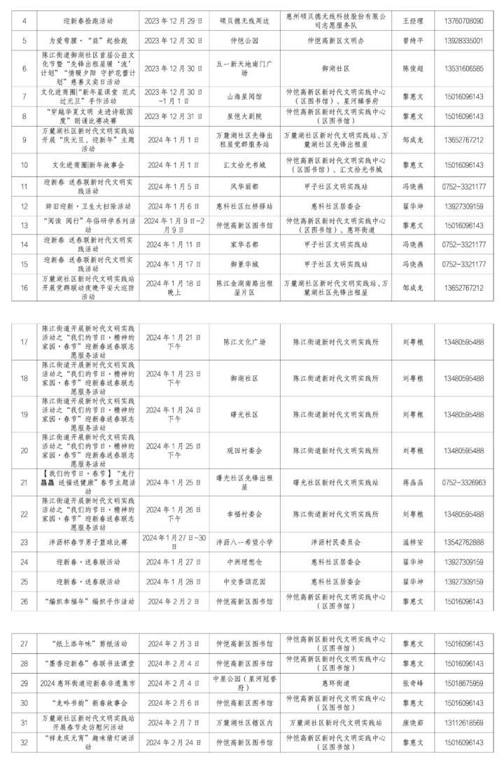 惠州日?qǐng)?bào)訊 (記者龔妍 通訊員梁玉丹)2024年元旦春節(jié),196項(xiàng)新時(shí)代文明實(shí)踐活動(dòng)伴您溫暖過節(jié)。12月30日,記者從市文明辦獲悉,2024年元旦春節(jié)期間,我市將以各新時(shí)代文明實(shí)踐中心(所、站)為依托,精準(zhǔn)對(duì)接群眾需求,堅(jiān)持“公益+志愿”理念,用活室內(nèi)與室外陣地,在全市范圍內(nèi)開展196項(xiàng)“強(qiáng)國復(fù)興有我”新時(shí)代文明實(shí)踐活動(dòng)。