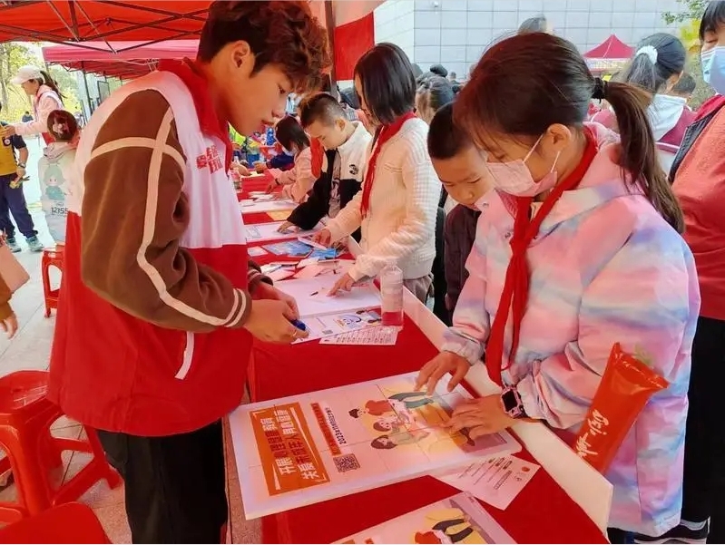 “什么是新時(shí)代生態(tài)文明建設(shè)的重要目標(biāo)?”“美麗中國!”少先隊(duì)員們一個(gè)個(gè)有序答題闖關(guān)。在“爭做新時(shí)代好隊(duì)員”紅領(lǐng)巾校外嘉年華攤位前,市少工委聯(lián)合市青少年宮校外大隊(duì)設(shè)置了包含禁毒、自護(hù)、學(xué)法、綠美廣東等4個(gè)主題的爭章活動(dòng),少先隊(duì)員們積極參與,勇奪“爭做新時(shí)代好隊(duì)員”市級(jí)特色章。