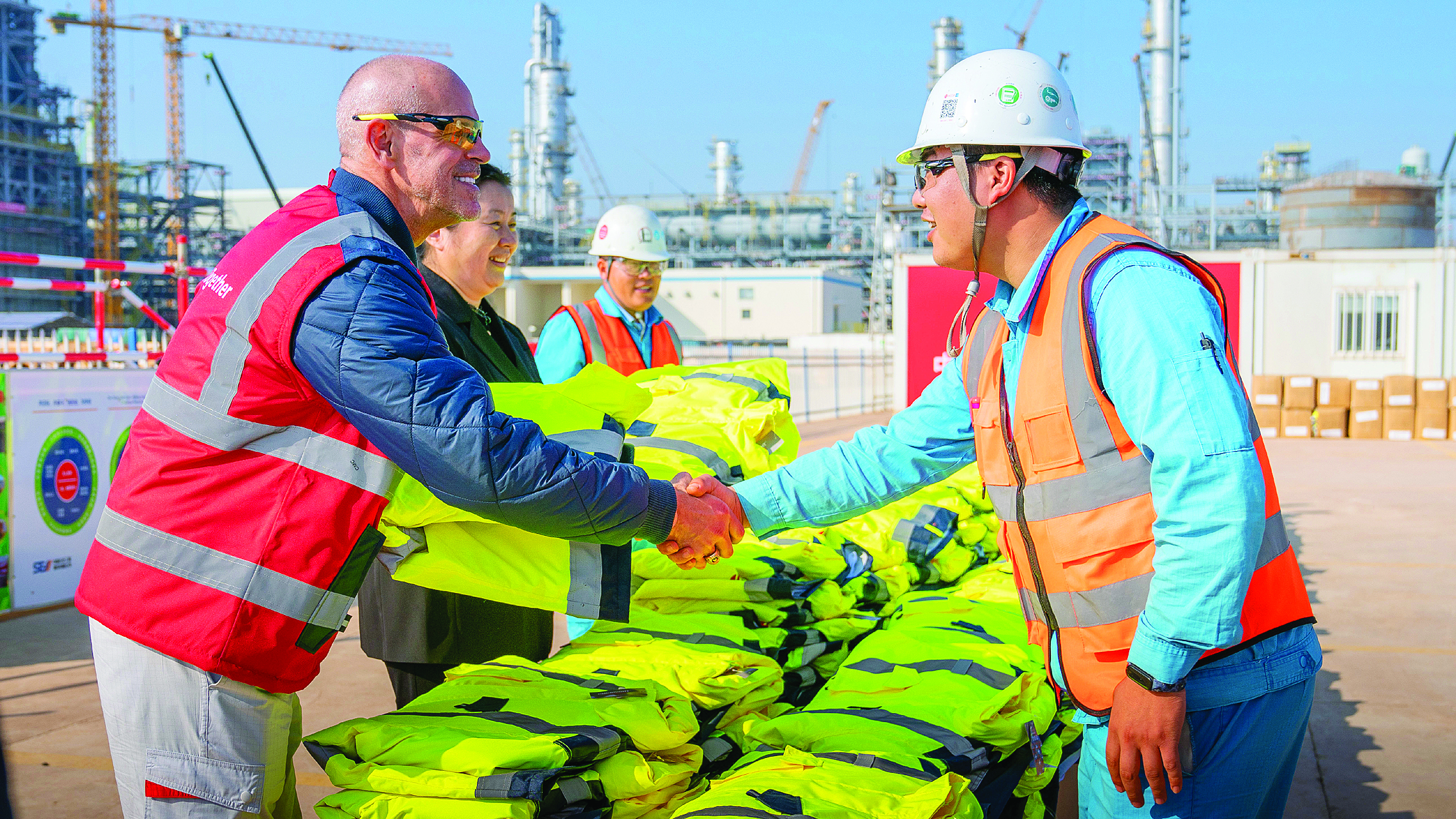 在裝置區(qū)的圍欄上,橫幅上“祝賀?松梨诨葜菀蚁╉椖窟_成4000萬安全人工時里程碑”的標語振奮人心。這一里程碑意味著,該項目自開工建設(shè)以來未發(fā)生任何損失安全人工時事件。1月4日上午,?松梨冢ɑ葜荩┗び邢薰荆ㄒ韵潞喎Q“?松梨凇保┡e辦4000萬安全人工時表彰活動,埃克森美孚全球項目公司項目執(zhí)行總監(jiān)傅維仕先生及管理層到施工現(xiàn)場為工人派送春節(jié)保暖大衣,感謝每位施工作業(yè)人員對安全建設(shè)作出的重要貢獻。