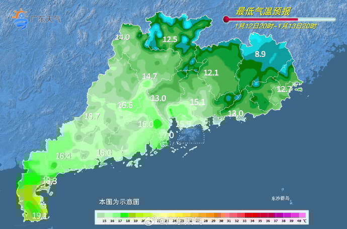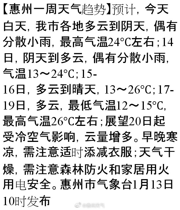 惠州方面,預(yù)計13日,我市多云,全市最低氣溫:11~14℃,最高氣溫:24℃左右。14日,陰天到多云,偶有分散小雨。20日起受冷空氣影響,云量增多。