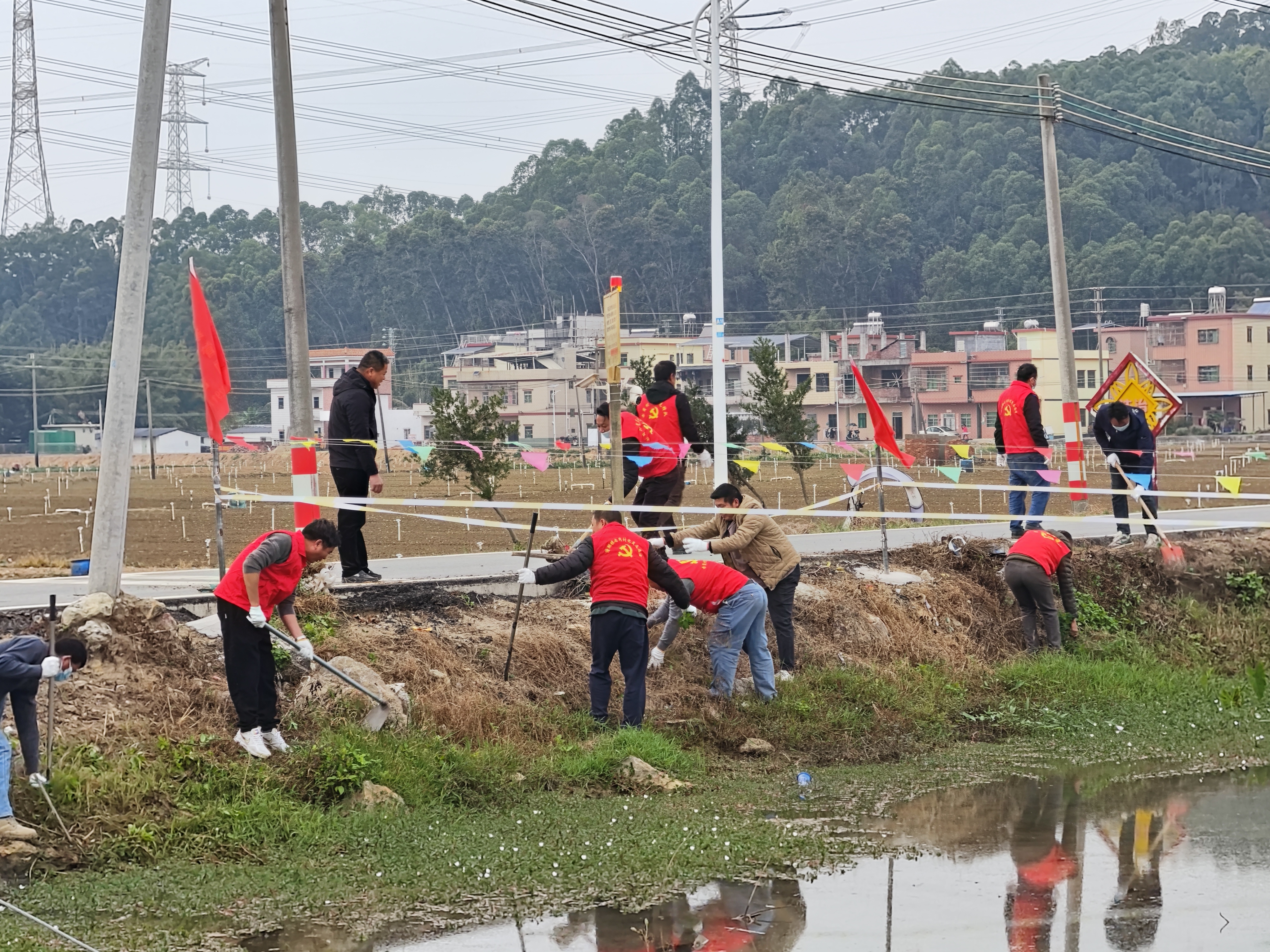 在仲愷潼湖鎮(zhèn)赤崗村筷子堤清淤疏浚現(xiàn)場,村民和志愿者積極清淤護(hù)岸。