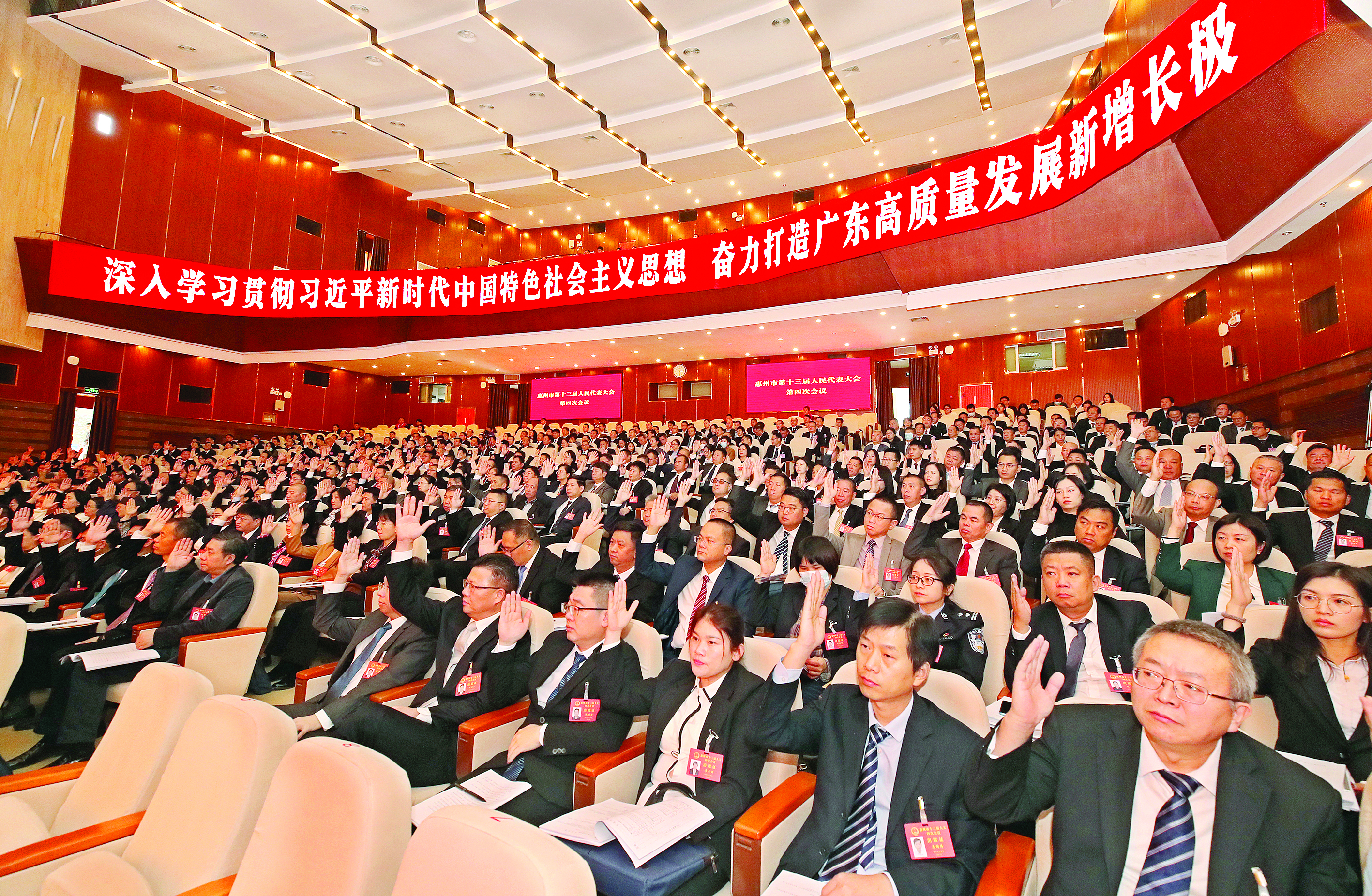 1月17日上午,惠州市十三屆人大四次會議在市會議中心開幕,市人大代表舉手通過有關決議;葜萑請笥浾哏姇承 攝