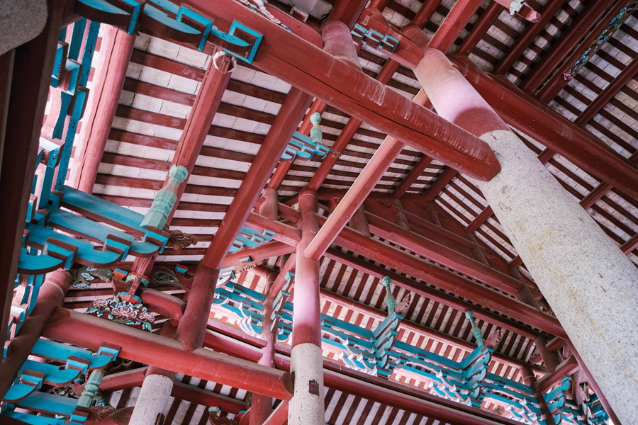 歸善學(xué)宮為灰瓦面、藍(lán)斗拱、紅殿柱、黃板瓦,整體色彩協(xié)調(diào)。