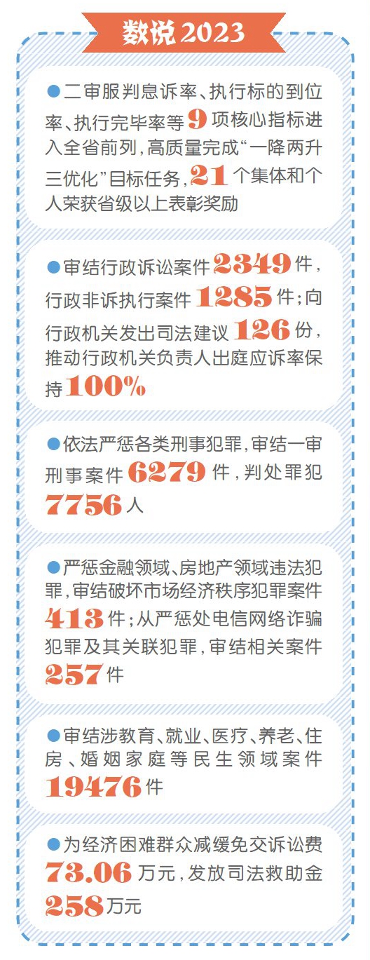 “2023年,全市法院深入貫徹落實(shí)省委‘1310’具體部署和市委工作要求,聚焦‘公正與效率’工作主題,真抓實(shí)干、能動(dòng)履職,推動(dòng)為大局服務(wù)、為人民司法,各項(xiàng)工作取得新發(fā)展、新成效!1月18日上午,在市十三屆人大四次會(huì)議上,惠州市中級(jí)人民法院(以下簡(jiǎn)稱(chēng)“惠州中院”)黨組書(shū)記、院長(zhǎng)朱可勝向大會(huì)作工作報(bào)告。據(jù)統(tǒng)計(jì),2023年,我市兩級(jí)法院共受理各類(lèi)案件133651件,審結(jié)124373件,法官人均結(jié)案436.4件,位列全省第二,并高質(zhì)量完成“一降兩升三優(yōu)化”目標(biāo)任務(wù)。