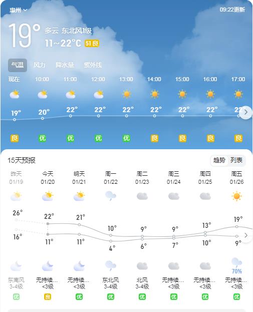 據(jù)市氣象臺(tái)預(yù)計(jì),20日我市各地多云間陰天,偶有零星小雨,14~23℃;21日,多云,10~20℃;22日,多云到陰天,8~15℃;23~24日,陰天間多云,有小雨,局部有霜(冰)凍,最低氣溫:北部和東部山區(qū)-1~3℃、其余地區(qū)4~7℃,日溫差小,體感陰冷;25日,多云間陰天,氣溫小幅上升,天氣仍寒冷;展望26日,陰天有小雨。