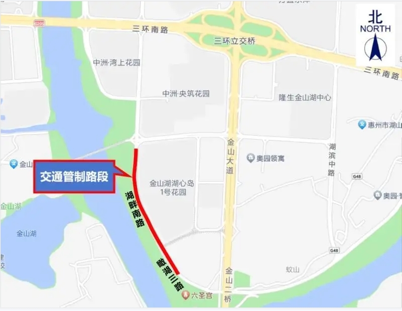 市區(qū)湖畔南路、瞰湖三路臨時(shí)交通管制示意圖。