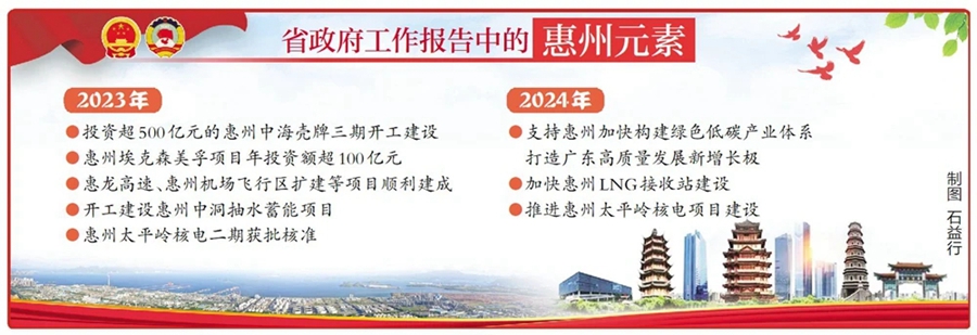 惠州中海殼牌三期、?松梨凇⑻綆X核電二期、惠州機場飛行區(qū)擴建、惠龍高速、中洞抽水蓄能項目……省十四屆人大二次會議1月23日上午開幕,惠州多個大項目被寫進省政府工作報告。記者注意到,報告提出,“支持惠州加快構(gòu)建綠色低碳產(chǎn)業(yè)體系、打造廣東高質(zhì)量發(fā)展新增長極”。