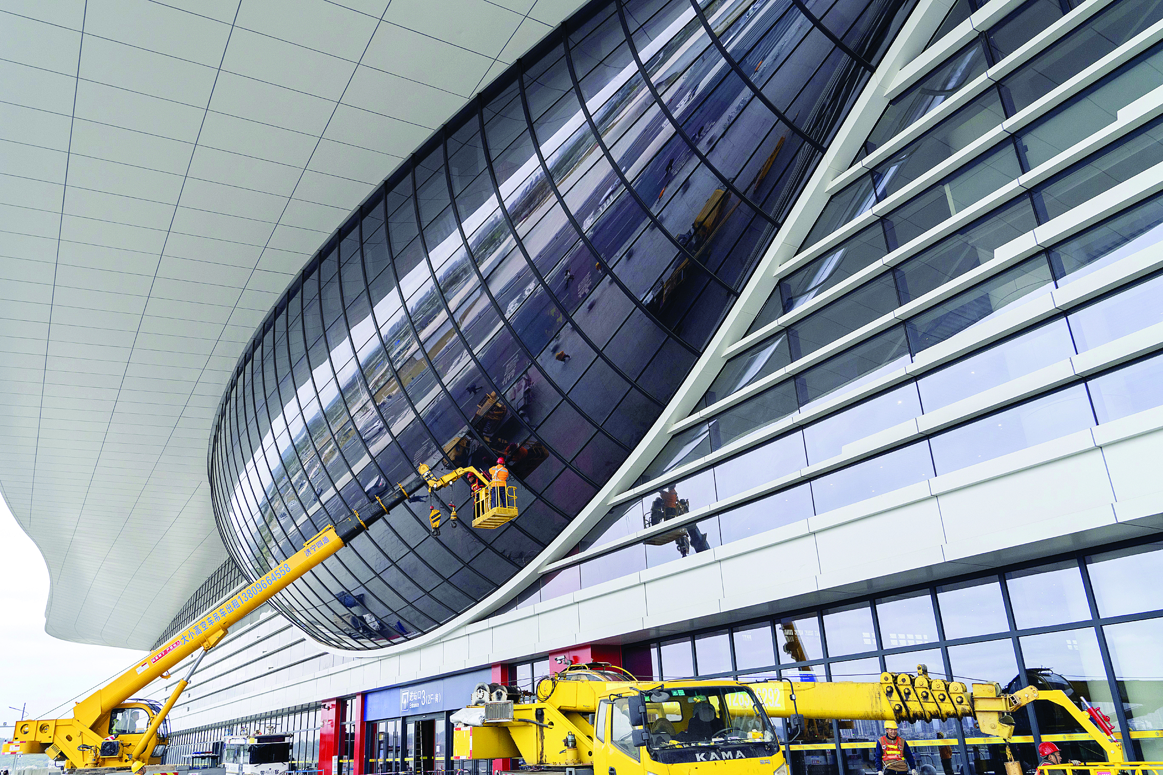 維修作業(yè)時施工人員通過升降設(shè)備更換異形玻璃。