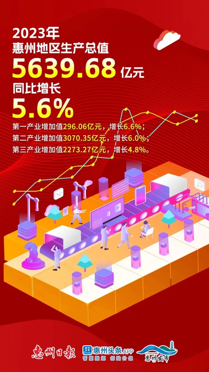 1月25日,惠州市統(tǒng)計(jì)局發(fā)布2023年惠州經(jīng)濟(jì)運(yùn)行簡(jiǎn)況:根據(jù)廣東省地區(qū)生產(chǎn)總值統(tǒng)一核算結(jié)果,去年惠州地區(qū)生產(chǎn)總值5639.68億元,同比增長(zhǎng)5.6%。GDP增速分別高于全國(guó)0.4、全省0.8個(gè)百分點(diǎn),位居珠三角前列。