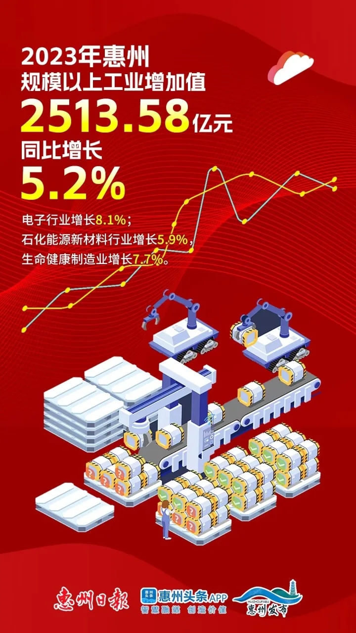 工業(yè)穩(wěn)則經(jīng)濟(jì)穩(wěn)。去年,惠州工業(yè)經(jīng)濟(jì)繼續(xù)回升。統(tǒng)計(jì)數(shù)據(jù)顯示,去年,惠州規(guī)模以上工業(yè)增加值2513.58億元,同比增長(zhǎng)5.2%,增速比前三季度上升1.2個(gè)百分點(diǎn)。