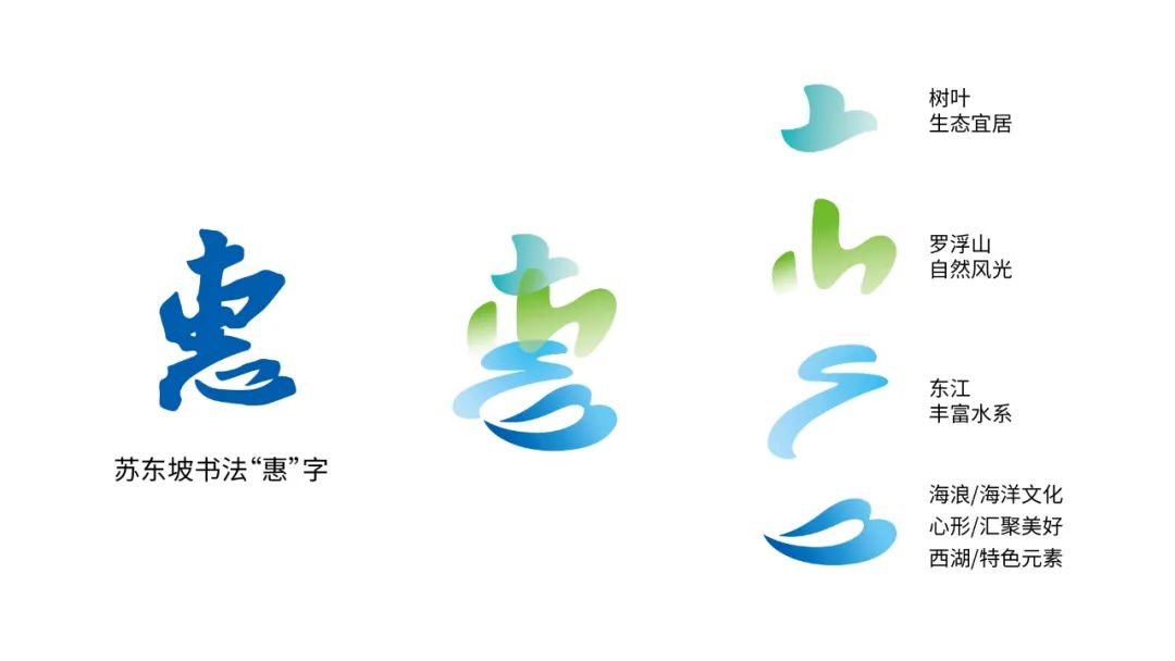 標(biāo)志整體造型由蘇東坡書法字體“惠”字創(chuàng)意變化而來,將城市品牌名稱與東坡文化進(jìn)行關(guān)聯(lián),同時強(qiáng)化惠州之“惠”的美好內(nèi)涵。其中,“惠”字頭綠色部分形似樹葉,象征城市生態(tài)宜居的自然環(huán)境,中間綠色部分,形似“山”字,突出惠州以羅浮山為代表的綠色自然;左側(cè)藍(lán)色線條部分,代表蜿蜒的“東江”,也表現(xiàn)惠州是具有豐富水系的城市。下面的藍(lán)色圖案形似翻滾的海浪,代表惠州獨(dú)具特色的海洋文化,同時又象征“中國西湖三十六,惟惠州足并杭州”的惠州西湖。