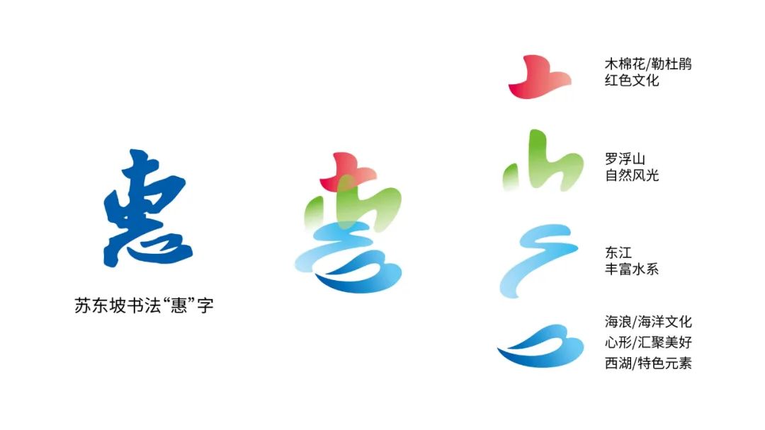 標(biāo)志整體造型由蘇東坡書法字體“惠”字創(chuàng)意變化而來,將城市品牌名稱與東坡文化進(jìn)行關(guān)聯(lián),同時強(qiáng)化惠州之“惠”的美好內(nèi)涵。其中,“惠”字頭紅色部分,象征城市英雄之花木棉花,同時形似市花勒杜鵑,是城市紅色文化的體現(xiàn);中間綠色部分,形似“山”字,突出惠州以羅浮山為代表的綠色自然;左側(cè)藍(lán)色線條部分,代表蜿蜒的“東江”,也表現(xiàn)惠州是具有豐富水系的城市。下面的藍(lán)色圖案形似翻滾的海浪,代表惠州獨(dú)具特色的海洋文化。同時又象征“中國西湖三十六,惟惠州足并杭州”的惠州西湖。