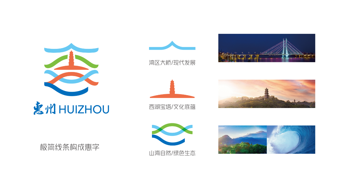 標(biāo)志用極簡的線條,勾勒出惠州的“惠”字,意在引導(dǎo)受眾對“惠州”的直接聯(lián)想,同時強(qiáng)調(diào)惠州之“惠”的核心內(nèi)涵。標(biāo)志最上部藍(lán)色線條,象征灣區(qū)大橋,指向未來發(fā)展;中間橙色部分為泗洲塔,彰顯惠州歷史底蘊(yùn);泗洲塔“背后”的綠線條形似遠(yuǎn)山倒影,與泗洲塔底部象征山海自然的藍(lán)綠橙線條構(gòu)成遠(yuǎn)山近水的視覺意象。字體以東坡書法字體為藍(lán)本,突出地方特色。整體對惠州的文化氣質(zhì)、歷史底蘊(yùn)及生態(tài)優(yōu)勢進(jìn)行突出表現(xiàn)。