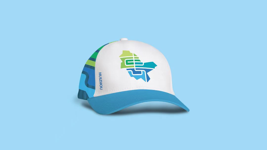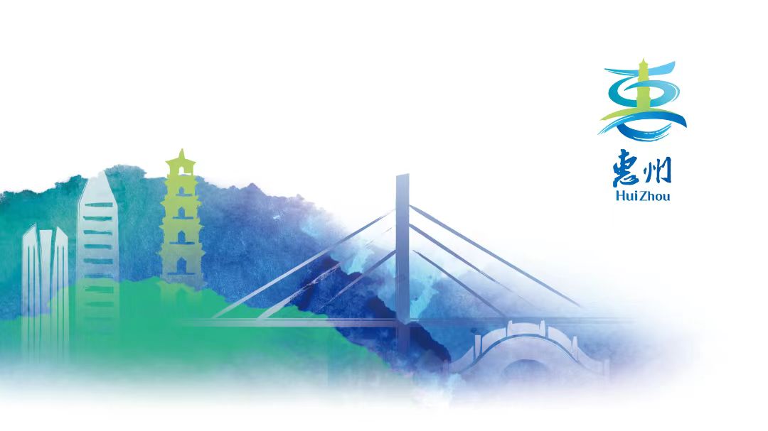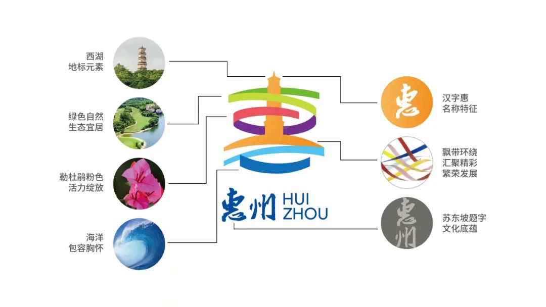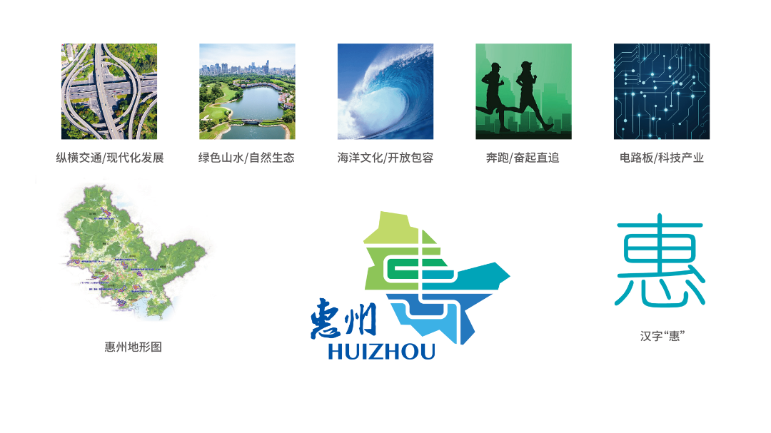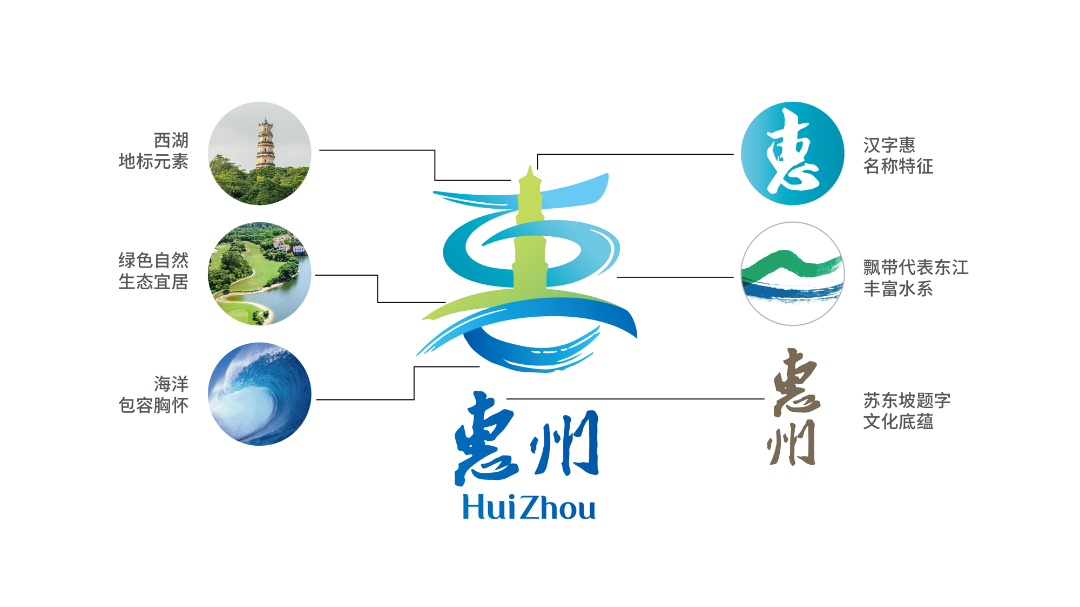 標(biāo)志整體輪廓由“惠州地圖”創(chuàng)意設(shè)計而成。地圖上勾勒出形似奔跑的“惠”字,構(gòu)成奔跑與奮起直追的視覺意象!盎荨弊志條又似城市縱橫互聯(lián)的交通體系與電路板,象征城市的現(xiàn)代發(fā)展與科技產(chǎn)業(yè)。整體造型頗具動感,表達(dá)惠州向上向好、奔向未來的發(fā)展態(tài)勢。標(biāo)志色彩則以藍(lán)、綠為主,象征綠色山水的自然生態(tài)與開放包容的海洋文化。