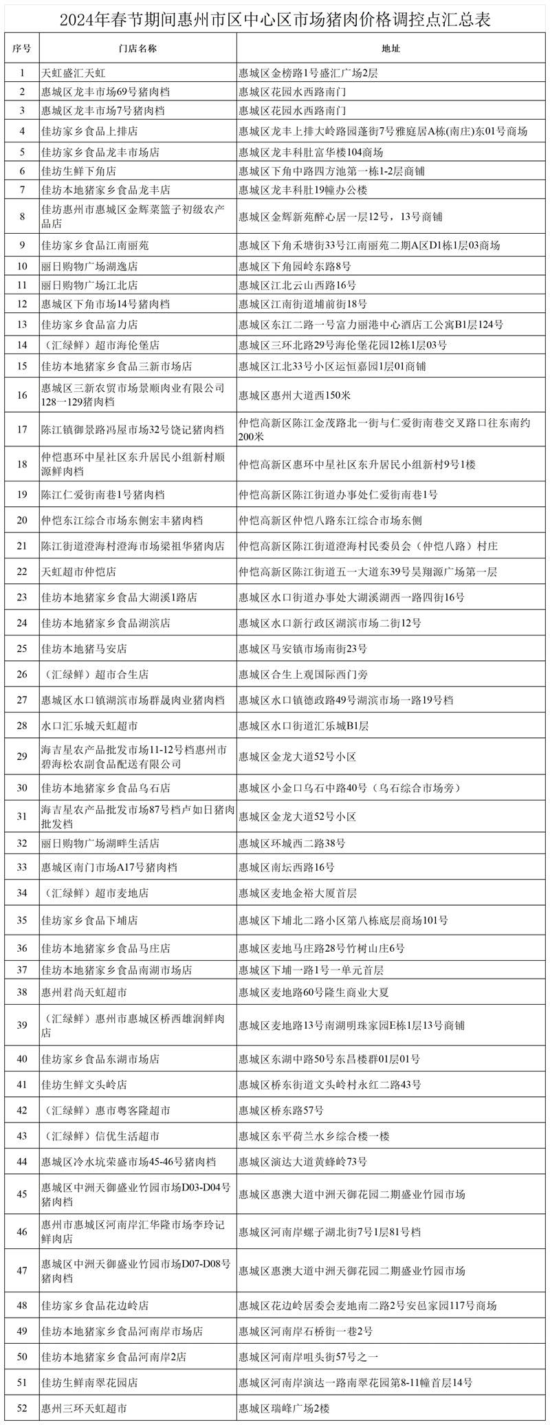 據(jù)介紹,52個調(diào)控點將由市肉聯(lián)廠有限公司、佳坊農(nóng)產(chǎn)品有限公司、麗日購物廣場、天虹商場、匯綠鮮果蔬農(nóng)民專業(yè)合作社等企業(yè)承擔政府調(diào)控豬肉具體銷售工作。屆時,各調(diào)控點將會在顯著位置懸掛“2024年春節(jié)期間政府價格惠民豬肉調(diào)控點”橫幅以及張貼“政府價格惠民豬肉調(diào)控價目表”。