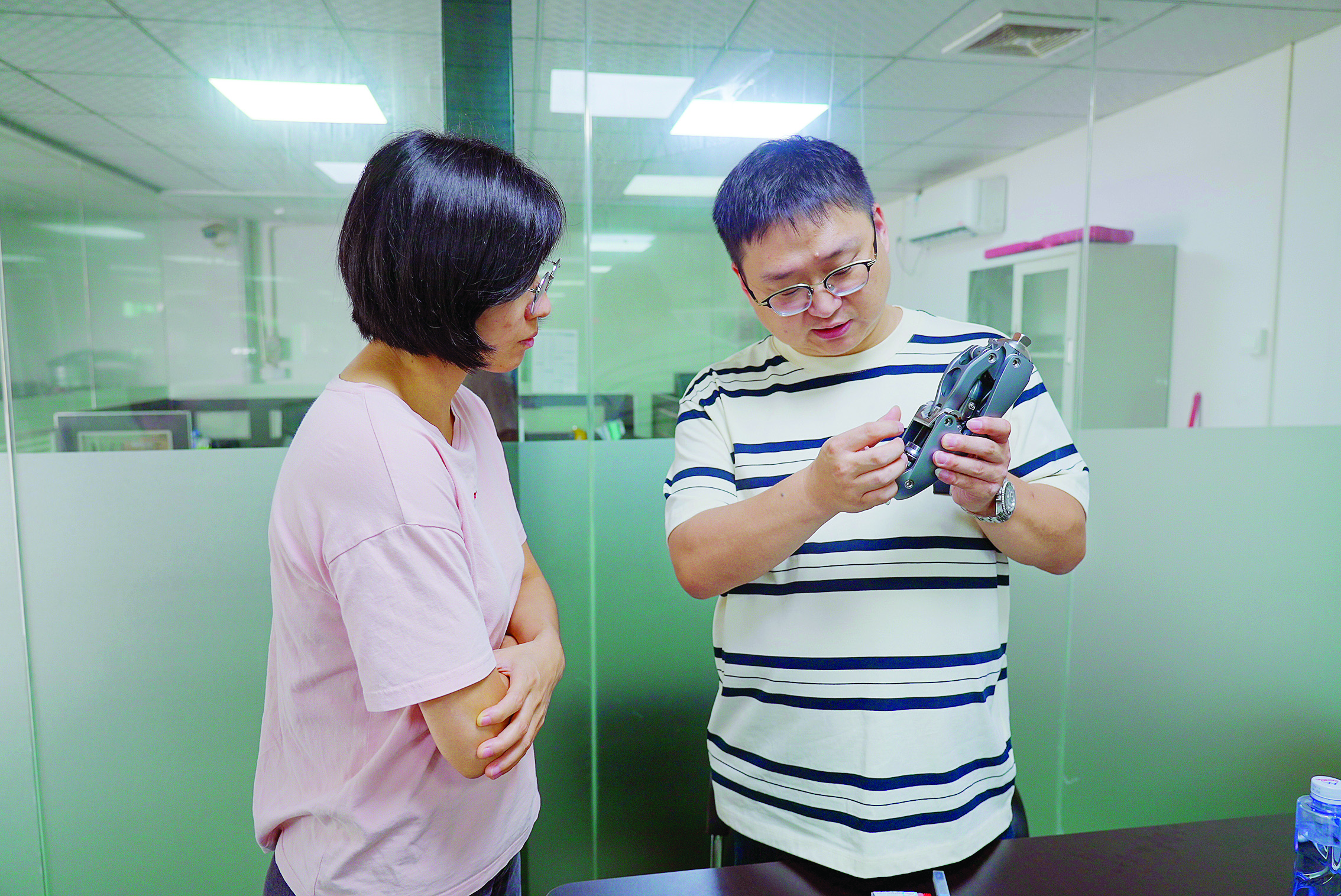 盛鑫(右)向記者介紹公司最新研發(fā)的假肢產(chǎn)品。
