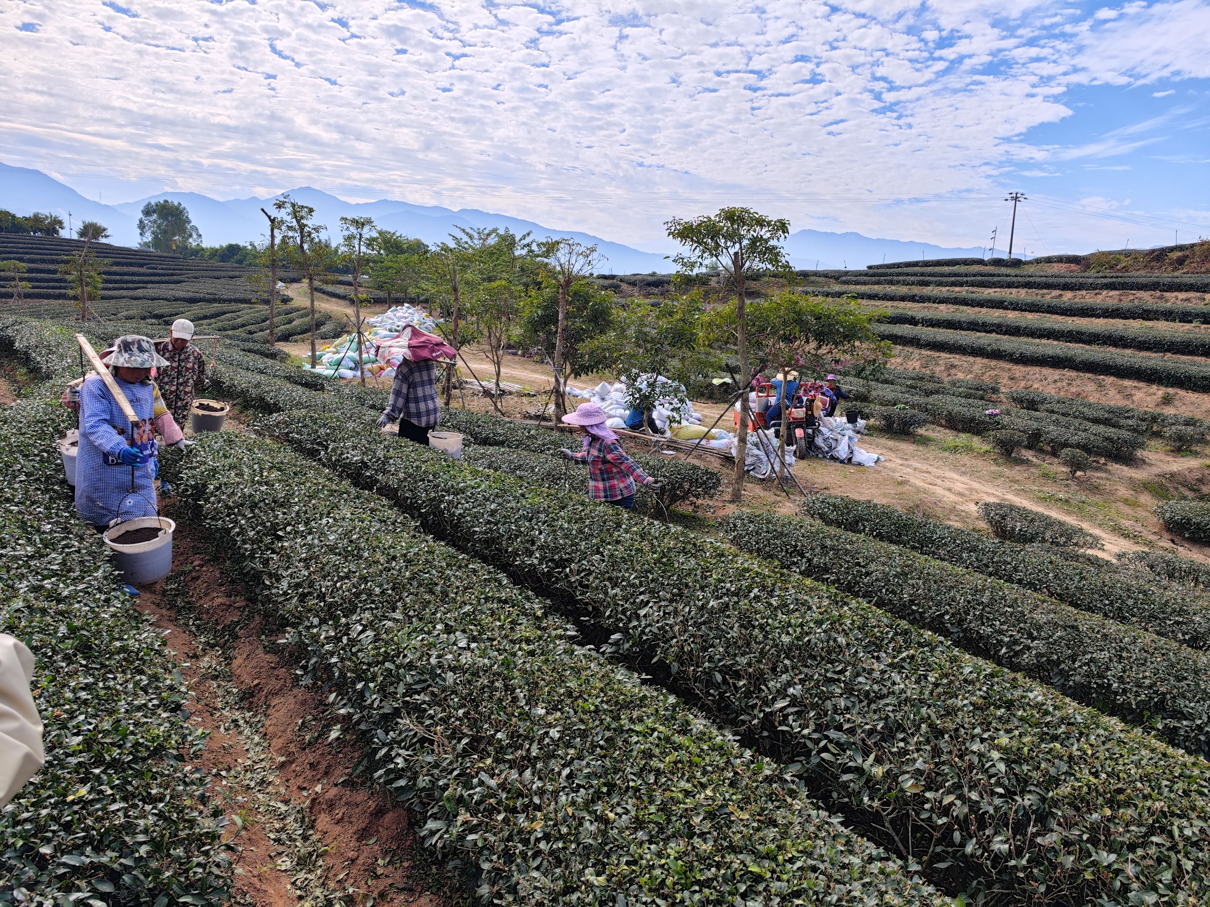 惠東縣多祝鎮(zhèn)明溪村“花海茶園”巖茶種植基地,工人們?cè)诮o茶樹(shù)施蚯蚓糞肥。