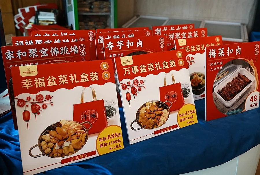 幸福盆菜禮盒、當(dāng)歸滋補(bǔ)家雞禮盒、福祿聚寶佛跳墻、梅菜扣肉……惠州天悅(嘉柏)大酒店在大堂辟出專區(qū),銷售各種盆菜和年夜飯?zhí)撞,有的單品價(jià)格低至幾十元,有的盆菜只需要200多元,實(shí)惠的價(jià)格頗受消費(fèi)者歡迎!斑@些菜式都是用新鮮食材現(xiàn)做的,消費(fèi)者只需要提前4個(gè)小時(shí)預(yù)訂就行!睏铢i介紹,消費(fèi)者可以到店領(lǐng)取,也可以通過(guò)跑腿送貨上門,“回到家里只需加熱便可食用,非常方便,味道也幾乎和堂食差不多。”