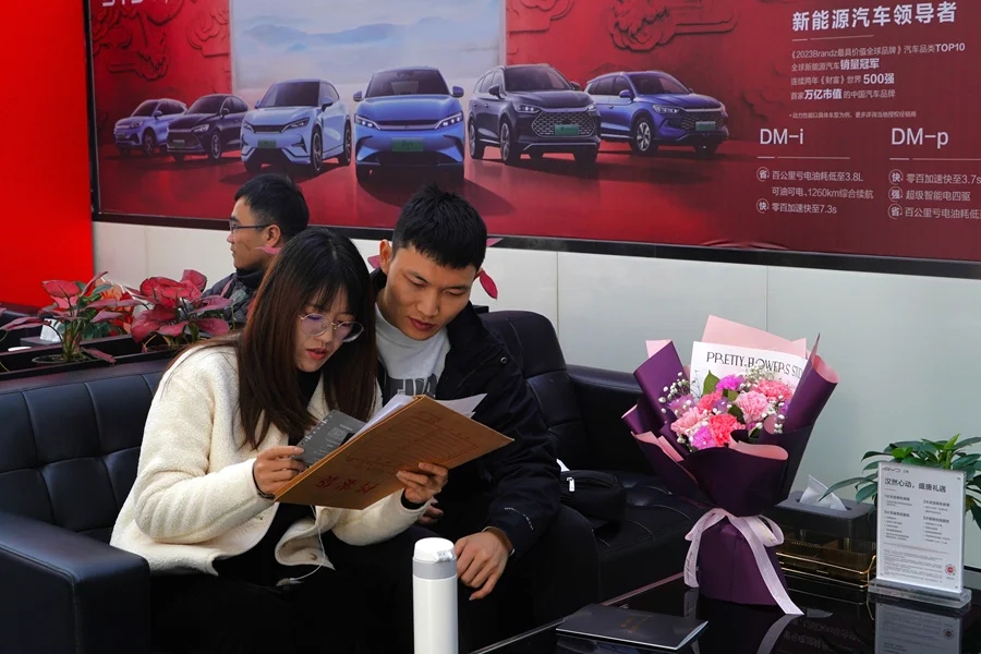 “春節(jié)前是傳統(tǒng)銷售旺季,廠商促銷力度大,疊加汽車金融的推廣,不少剛需市民都會(huì)選擇在這時(shí)出手,開新車回家過年!北葋喌贤醭W(wǎng)惠州惠迪4S店市場總監(jiān)張景龍表示,比亞迪廠商在春節(jié)前推出購車補(bǔ)貼優(yōu)惠,最高補(bǔ)貼3萬多元,2024年1月份店賣出了100多輛車,其中混動(dòng)車型和純電車型銷量占比各一半。