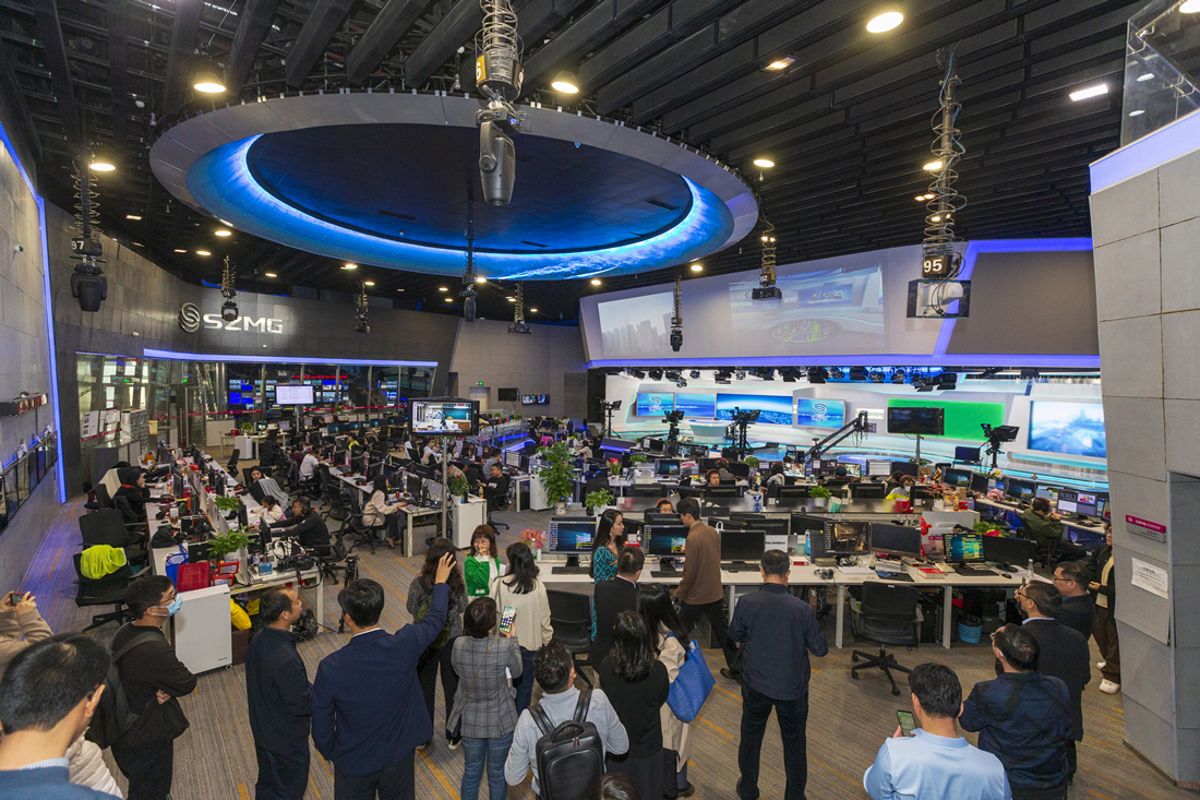 走訪調(diào)研團(tuán)第一站來到在深圳廣電集團(tuán),會員們分別參觀了廣電集團(tuán)開放式演播廳、新聞導(dǎo)播間、虛擬演播廳、廣播全媒體中心直播間、融媒體技術(shù)運行中心等主要新聞制作地點,體驗前沿的虛擬直播技術(shù)。參觀新聞導(dǎo)播間時,看著每天都在電視上播出的畫面背景近在咫尺,協(xié)會成員紛紛坐上主播臺,對著攝像機進(jìn)行新聞播報,做一回電視新聞主持人。