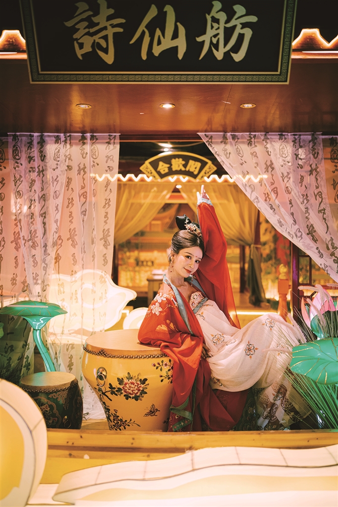 身著唐朝服飾穿梭于店內(nèi)的士兵、侍女,挑著扁擔的小販,華麗的唐朝歌舞……一場“唐宮夜宴”生動浮現(xiàn)。因為場景的延伸,各種飲食滋味也有了百般變化,讓游客擁有更加豐富、深刻的用餐感受。