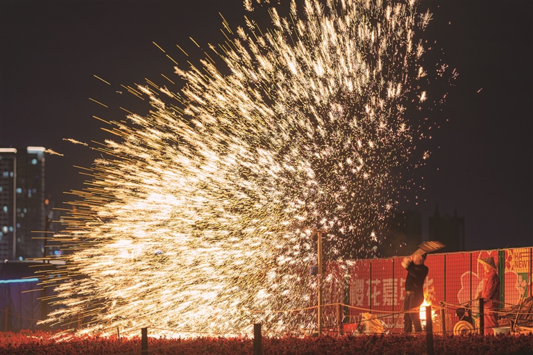 “民間焰火之最”打鐵花在一片花田中精彩呈現(xiàn)。