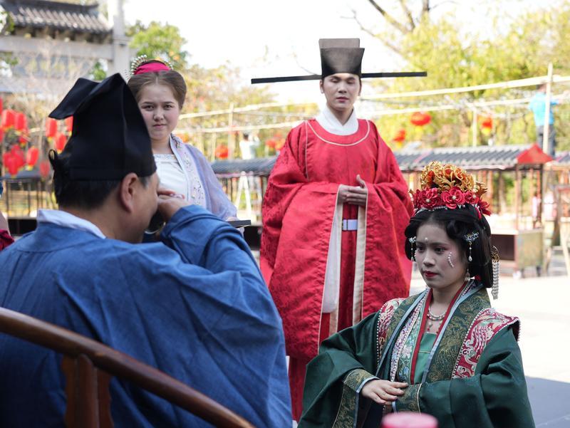 宋式婚禮彩排現(xiàn)場(chǎng);葜萑?qǐng)?bào)記者張藝明 攝