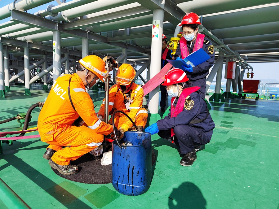 惠州港海關(guān)關(guān)員在馬鞭洲原油碼頭對(duì)進(jìn)口原油進(jìn)行取樣。 惠州日?qǐng)?bào)記者劉煒煒 通訊員吳雨霏 攝