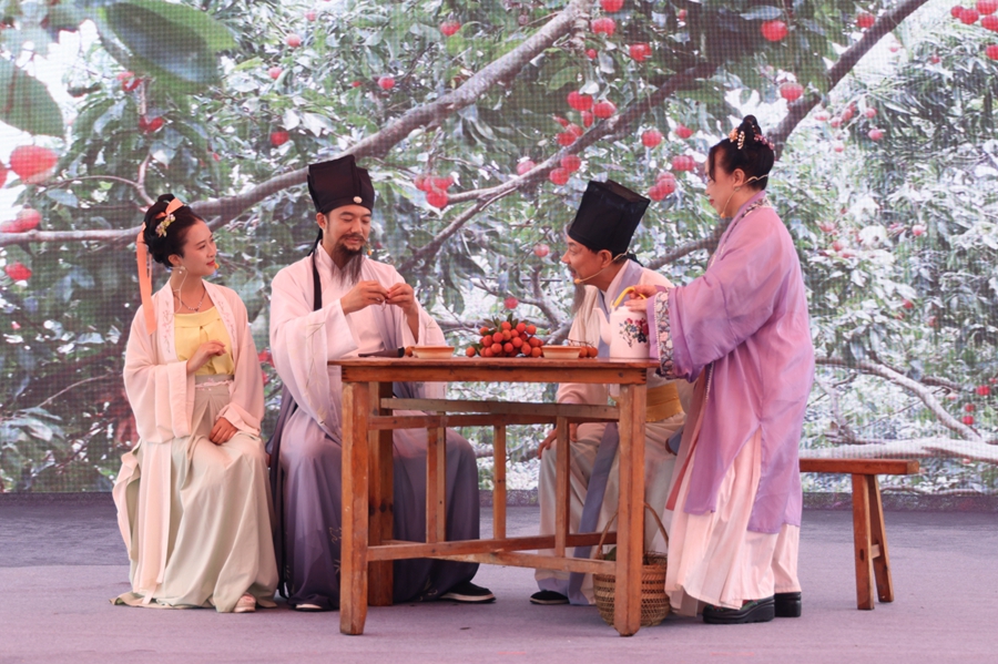 東坡寓惠期間寫下的“日啖荔枝三百顆,不辭長作嶺南人”成為嶺南千年不衰的廣告詞。這是情景劇《他鄉(xiāng)遇故知》劇照。