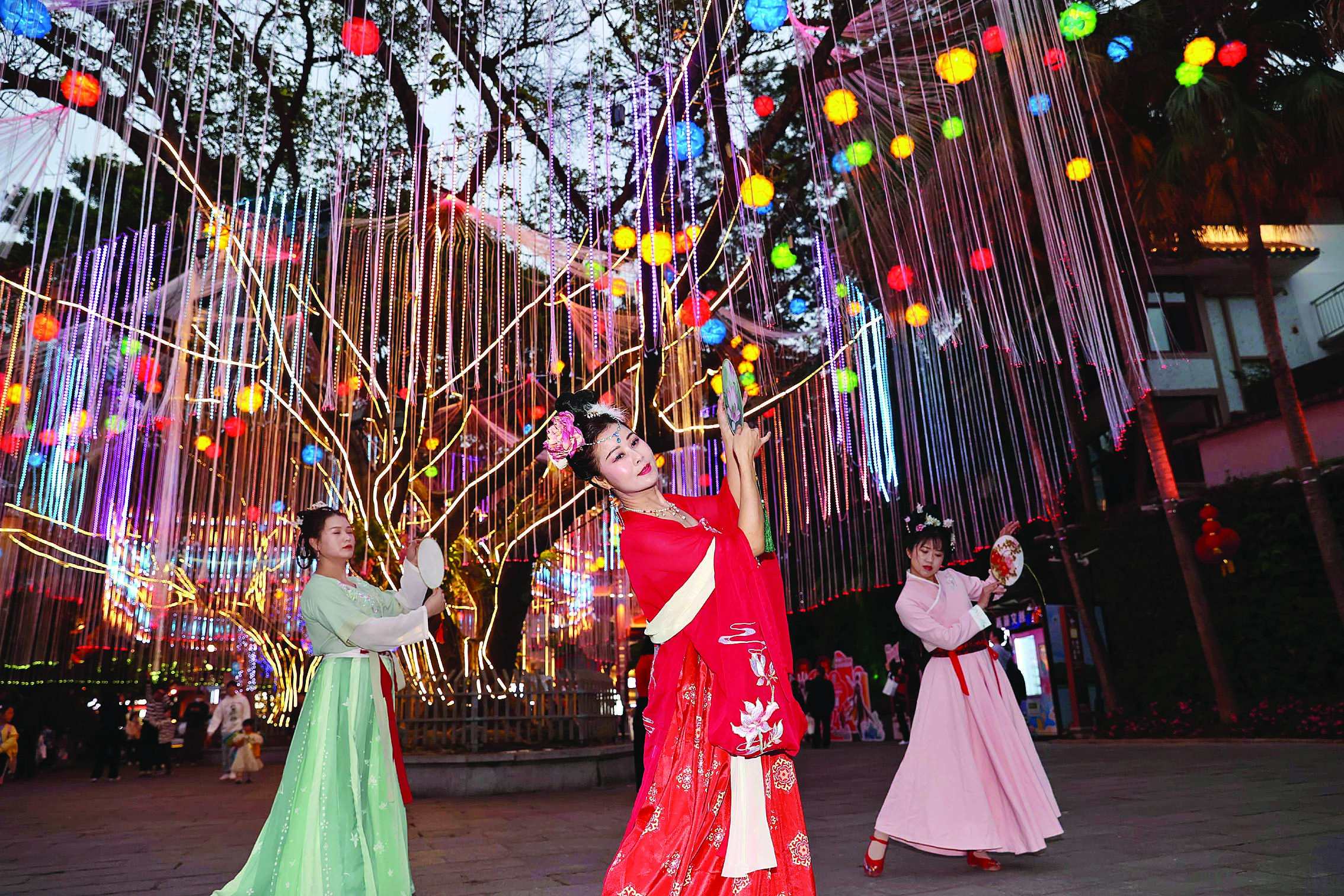 幾名女孩穿著傳統(tǒng)服飾在西湖花燈下跳舞。 惠州日?qǐng)?bào)記者楊建業(yè) 攝