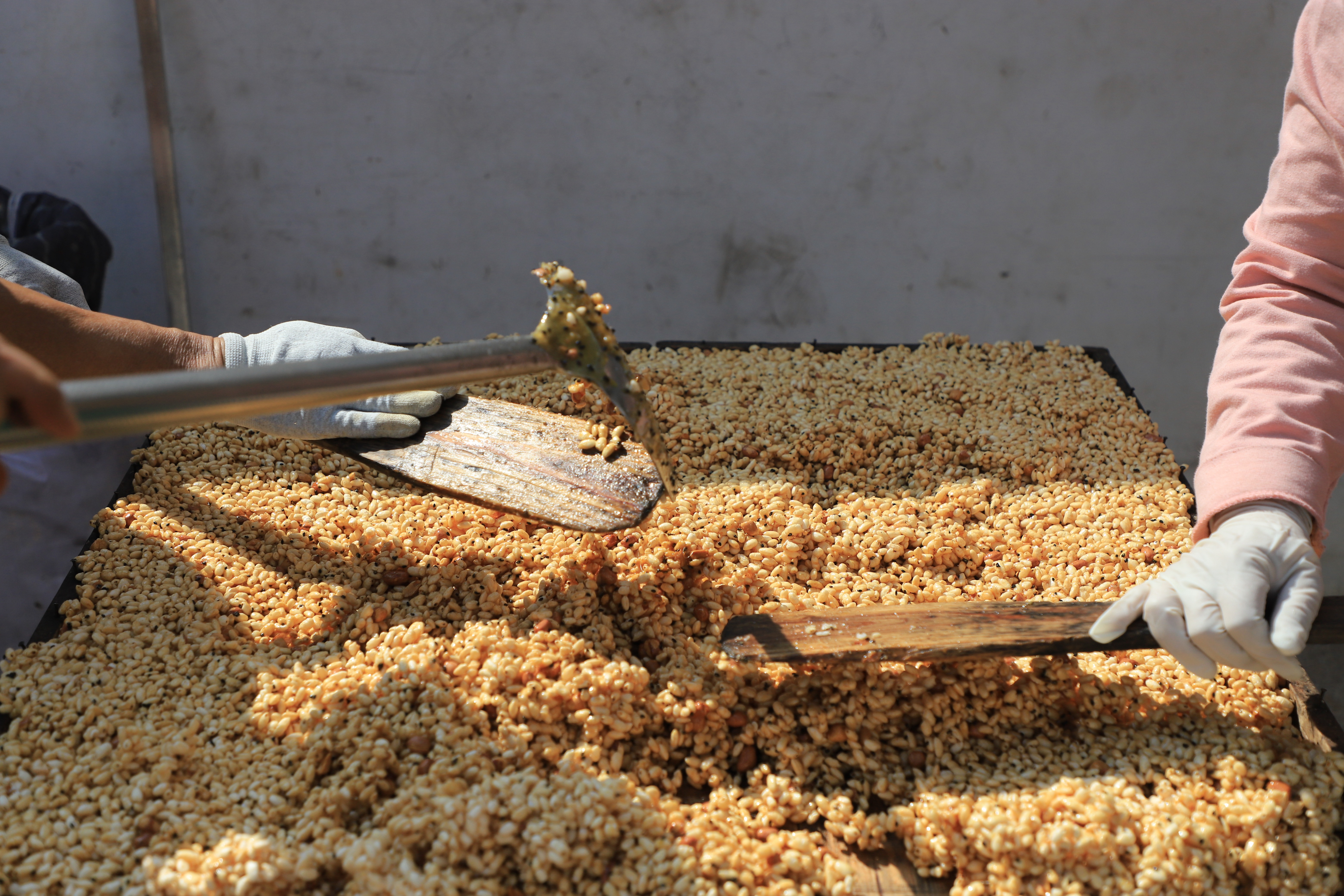 第二步,將白糖倒進鍋里,用大火干煮,直到白糖全部熔化,再放入生花生,待花生差不多熟了,再放入生芝麻,滾煮一會,將爆米花倒入鍋內(nèi),通過不斷攪拌讓其與糖漿、花生、芝麻充分融合!吧ㄉ谷氚滋菨{里干煮,熟后很爽脆,就像炒的一樣!闭f起這一步驟的訣竅,鄧培興說,“一定要用生花生,這樣花生就不會因為燒得太熟、太脆而容易碎。芝麻一定要后下,不然會太焦!
