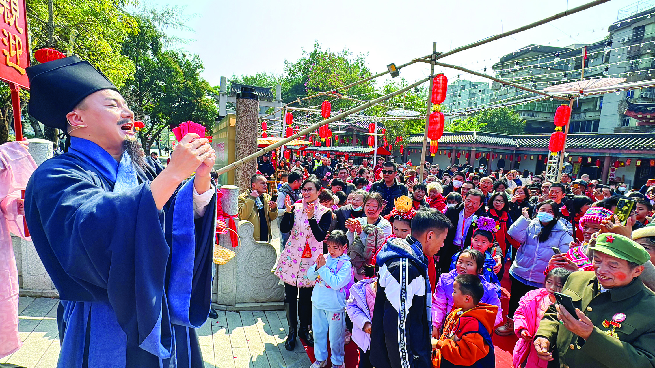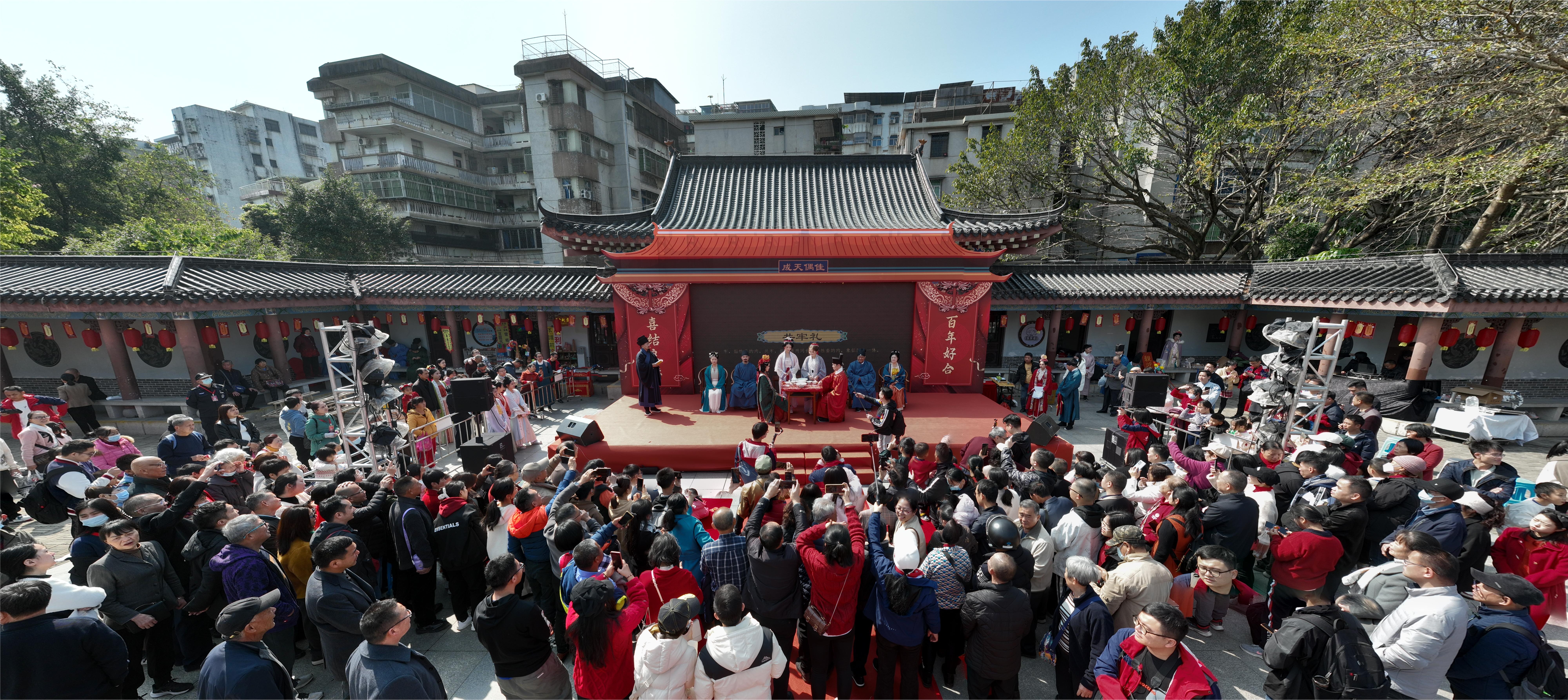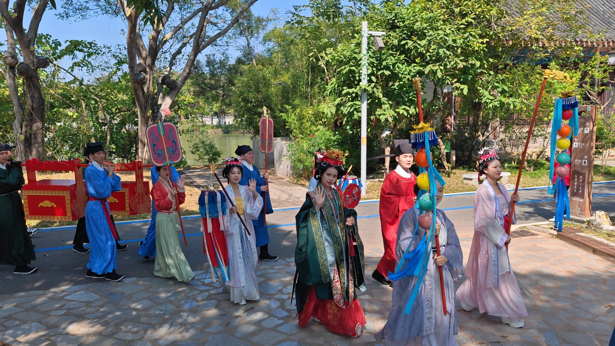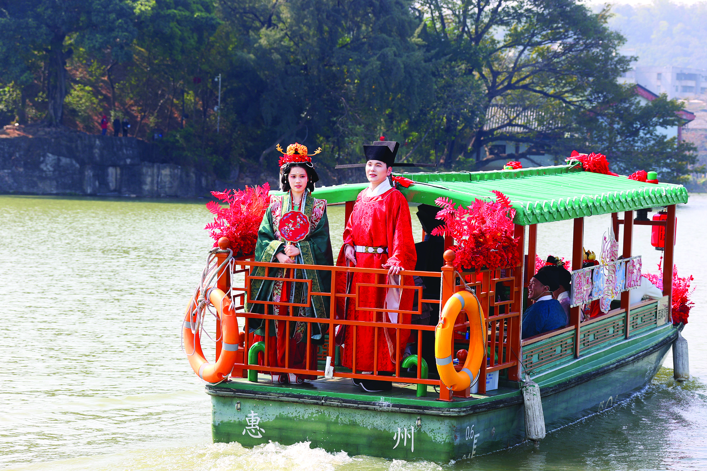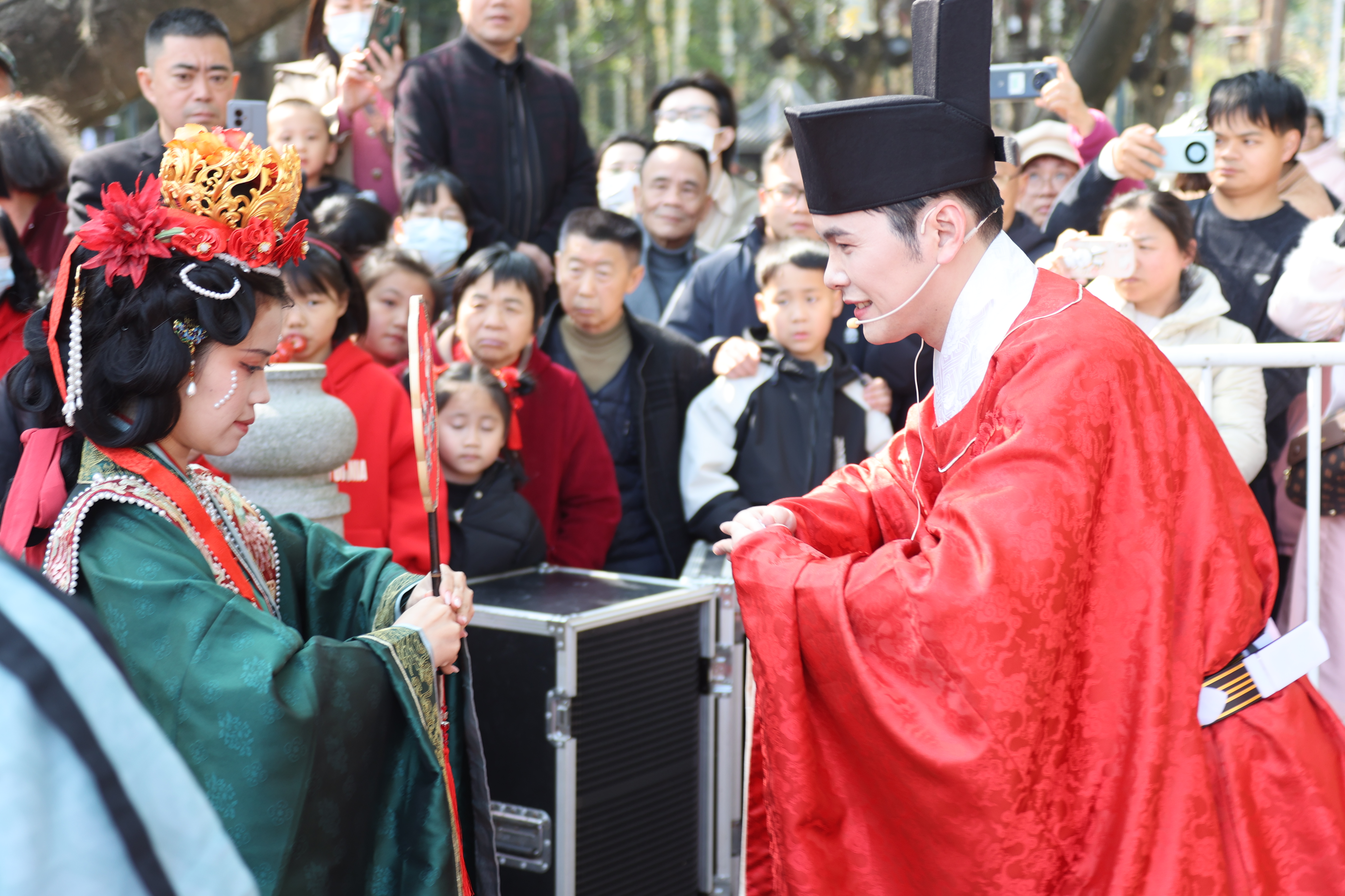 當(dāng)天,由市委宣傳部、市文化廣電旅游體育局指導(dǎo),惠州日報社、惠州市西湖景區(qū)管理中心主辦的“‘羅浮山下四時春’——嶺南書院·豐湖書院春節(jié)主題活動”進(jìn)入第三天,為現(xiàn)場市民游客及線上網(wǎng)友帶來了一場“夢回大宋·宋式婚禮秀”。