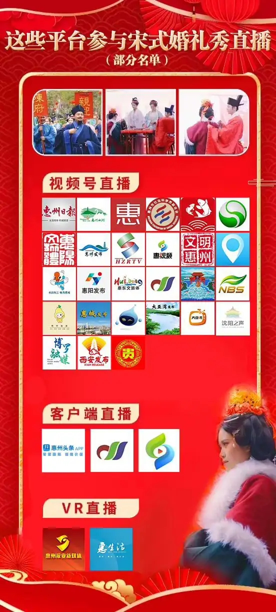 “夢回大宋·宋式婚禮秀”同步開啟大型直播。據(jù)不完全統(tǒng)計,本次直播覆蓋全網(wǎng)50多個平臺,總觀看量超500萬人次。其中,惠州本地新媒體平臺超40個,惠州頭條客戶端直播收看量超102萬人次,惠州日報云頻道10.2萬人次。