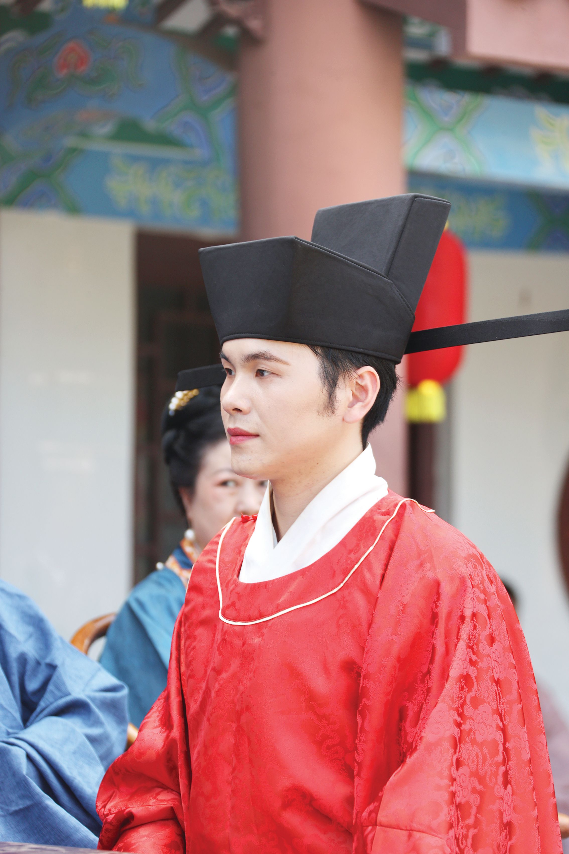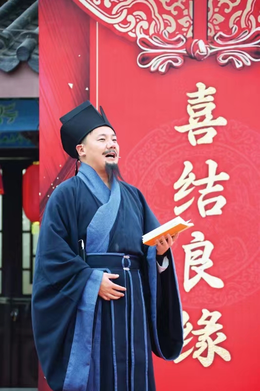來自陜西漢中的唐東是一名專業(yè)婚禮策劃、主持人。一個(gè)月前,他接到了扮演蘇東坡角色的任務(wù),擔(dān)任“儐相”一職。唐東說,在宋式婚禮秀中,儐相角色臺(tái)詞多,而且是文言文,自己第一次演繹“蘇東坡”角色,如何展現(xiàn)東坡先生的豪邁之情,給他帶來一定的挑戰(zhàn)。時(shí)間緊、任務(wù)重,唐東前期查閱資料學(xué)習(xí)東坡文化,希望將角色演繹得盡善盡美。同時(shí),他還參與臺(tái)詞的編排和流程的制定及完善,對婚禮秀演繹場景提出專業(yè)的意見建議。