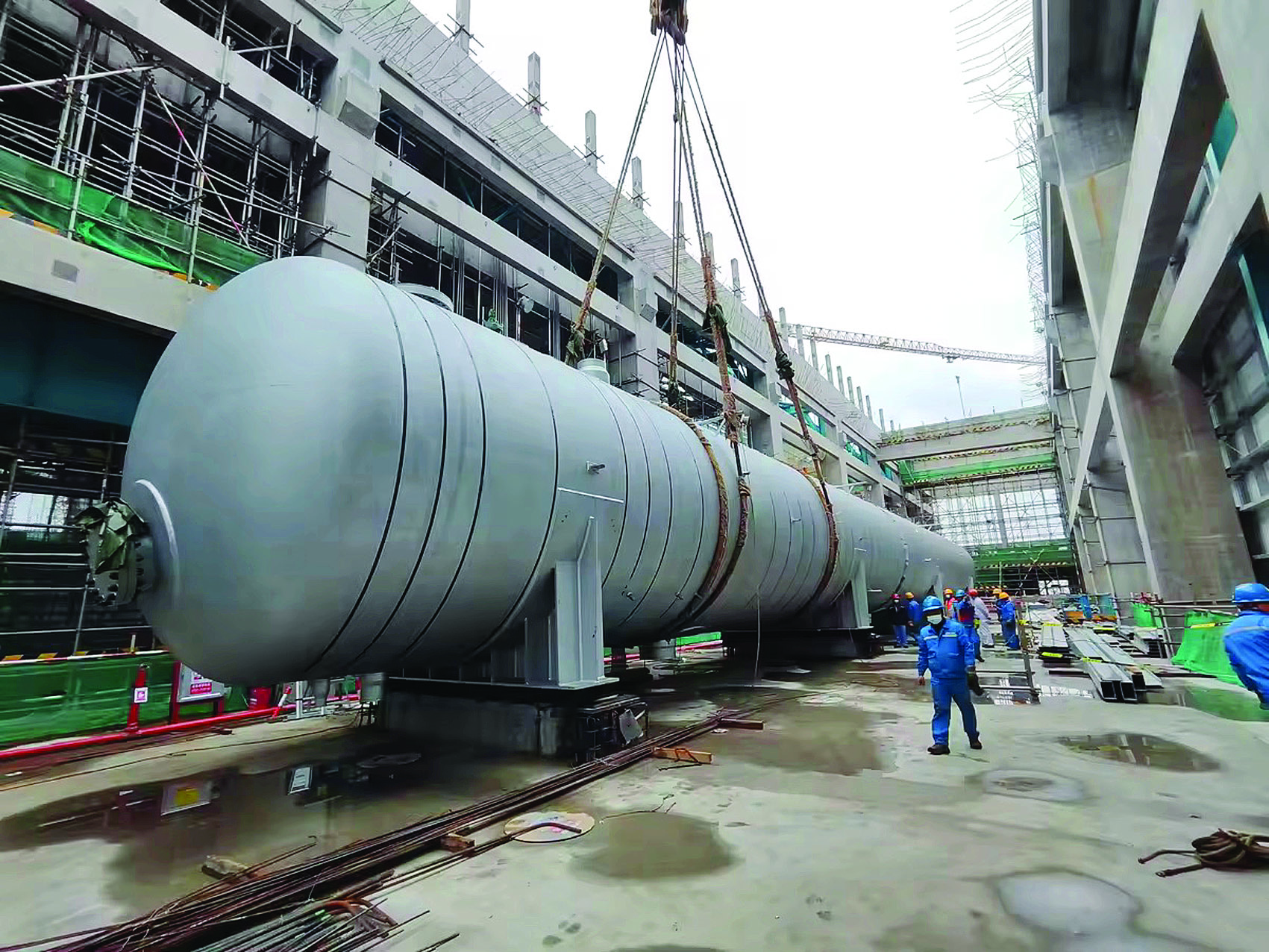 據(jù)介紹,除氧器是整個核電設(shè)備中最長的容器設(shè)備,總長約46米,總重量約220噸。它也是核電二回路的重要設(shè)備之一,主要為二回路給水熱力除氧,以提高進入蒸汽發(fā)生器給水的品質(zhì)。