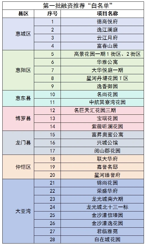 日前,第一批項(xiàng)目名單出爐了!28個(gè)房地產(chǎn)項(xiàng)目被列入融資推薦“白名單”,涵蓋惠州各縣區(qū),其中惠城區(qū)4個(gè),惠陽區(qū)5個(gè),惠東縣2個(gè),博羅縣3個(gè),龍門縣3個(gè),仲愷高新區(qū)3個(gè),大亞灣開發(fā)區(qū)8個(gè)。