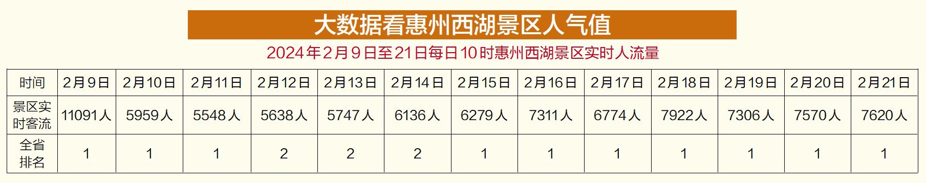 實際上,惠州西湖景區(qū)不僅“稱霸”全市,實時人流量也在全省230多家4A級以上景區(qū)中持續(xù)霸榜。大數(shù)據(jù)顯示,在2月9日至2月21日13天中,惠州西湖共有10天位列廣東省4A級以上景區(qū)實時人流排名榜第一,另外三天排第二,僅次于同在惠州的巽寮濱海旅游度假區(qū)。