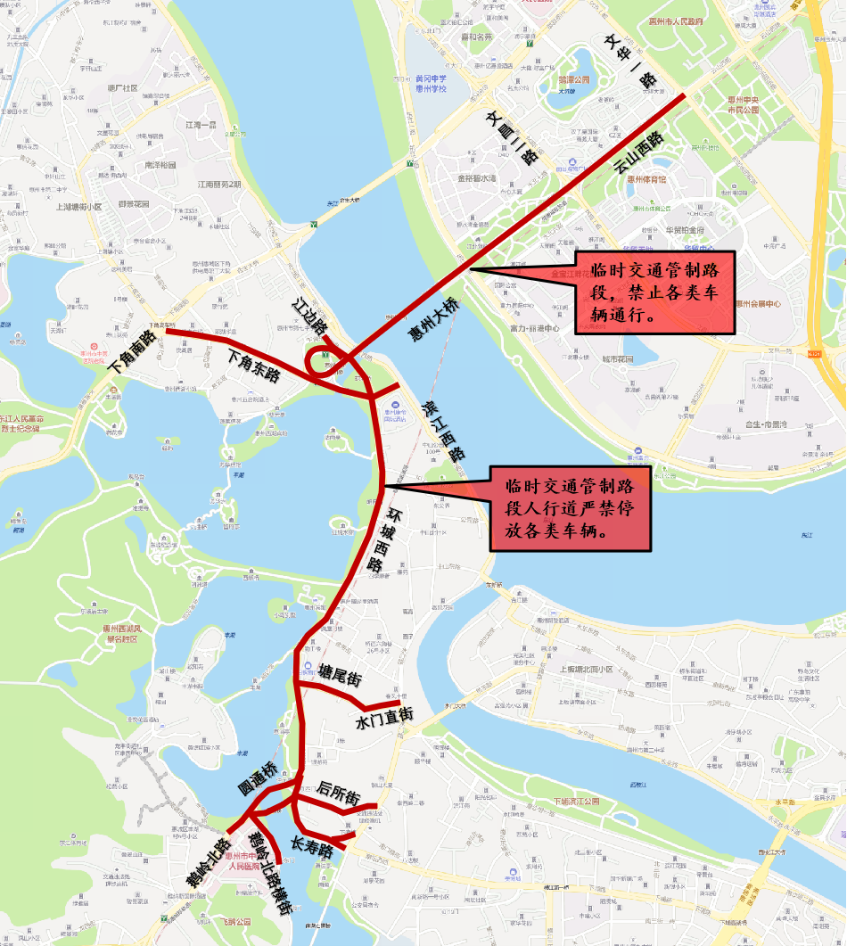 (一)對(duì)云山西路(文華一路至文昌二路路段)、惠州大橋、下角東路、江邊路(下角東路至七中門口支路路段)、環(huán)城西路、塘尾街、水門直街、后所街、長壽路、圓通橋、鵝嶺北路(圓通橋至黃塘路路段)、鵝嶺北路橫街(圓通橋至中心人民醫(yī)院小東門路段)等路段實(shí)施雙向交通管制,禁止各類車輛通行。