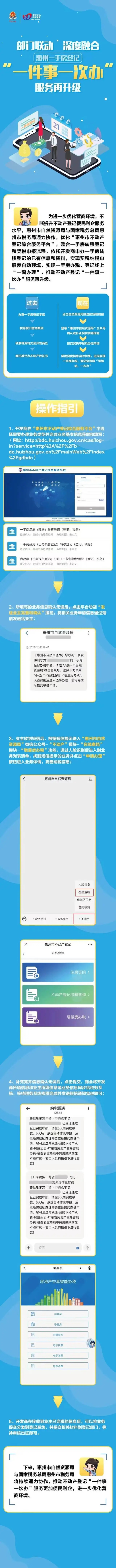 “一手房辦稅、登記線上‘一窗辦理’上線后,惠州已順利辦理5宗業(yè)務(wù),得到辦事群眾的一致好評(píng)!笔凶匀毁Y源局相關(guān)負(fù)責(zé)人表示,為進(jìn)一步優(yōu)化營(yíng)商環(huán)境,不斷提升不動(dòng)產(chǎn)登記便民利企服務(wù)水平,該局與國(guó)家稅務(wù)總局惠州市稅務(wù)局通力協(xié)作,以一手房登記這一高頻業(yè)務(wù)為切入點(diǎn),優(yōu)化業(yè)務(wù)流程,通過省級(jí)“總對(duì)總”渠道實(shí)現(xiàn)契稅完稅信息實(shí)時(shí)共享,最終實(shí)現(xiàn)一手房辦稅、登記全流程“零跑動(dòng)、一次辦”,推動(dòng)不動(dòng)產(chǎn)登記“一件事一次辦”服務(wù)再升級(jí)。