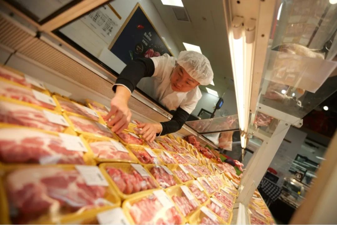 超市工作人員在擺放豬肉;輬笕襟w記者黃鑫威 攝