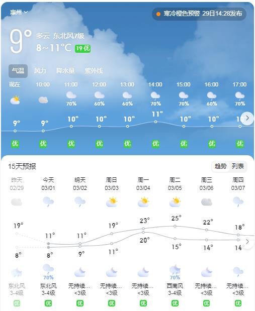 惠州日報訊 (記者劉建威)惠州市氣象臺2月29日14時25分將惠城區(qū)、仲愷高新區(qū)和大亞灣開發(fā)區(qū)寒冷黃色預警信號升級為橙色。記者了解到,其余縣(區(qū))寒冷預警信號也相繼升級為橙色。