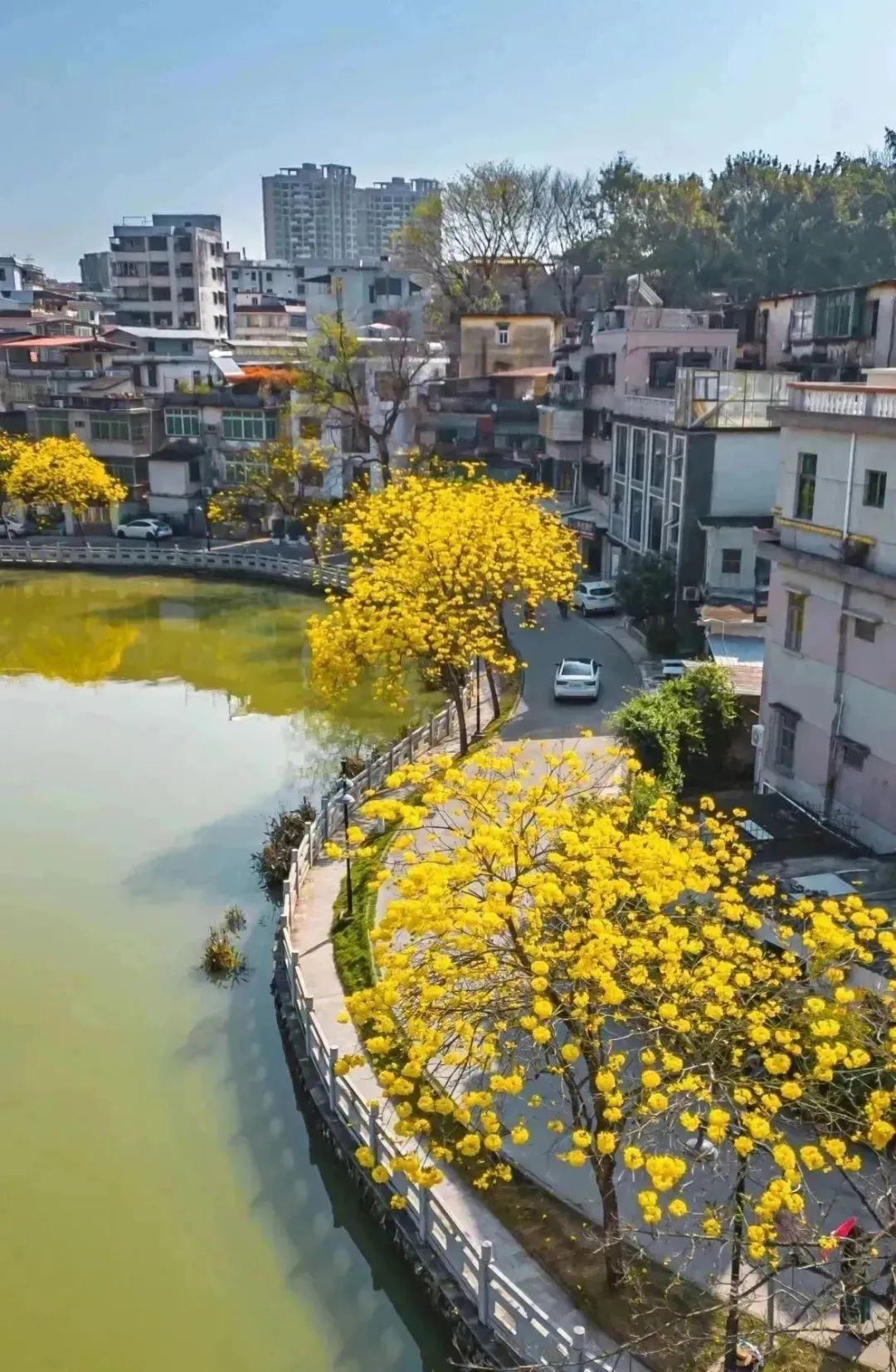 這兒的黃花風(fēng)鈴木傍湖而居,