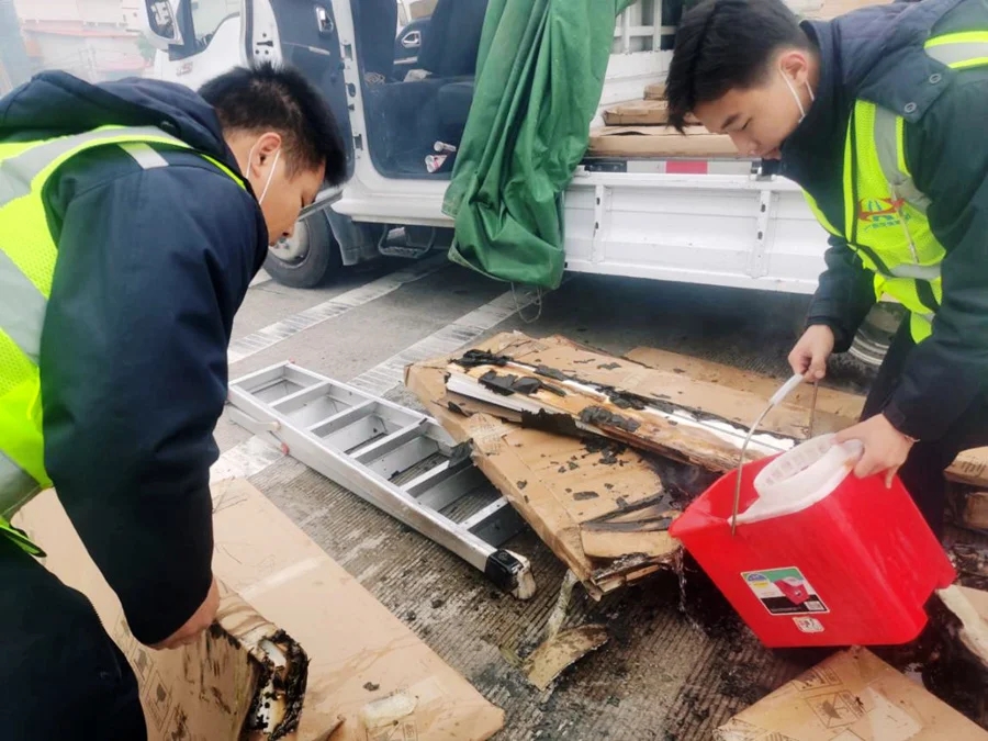 劉良貴聽后,判斷明火應該在貨物底部,滅火器無法直接熄滅底部明火,于是和車主四人齊力把家具板材卸到地面,在查找火源的同時幫助車主挽救損失。翻開貨物后,劉良貴等人發(fā)現(xiàn)此時板材過火面積已達四分之三。為快速撲滅火苗,許森鵬用拖桶提來自來水幫助滅火。
