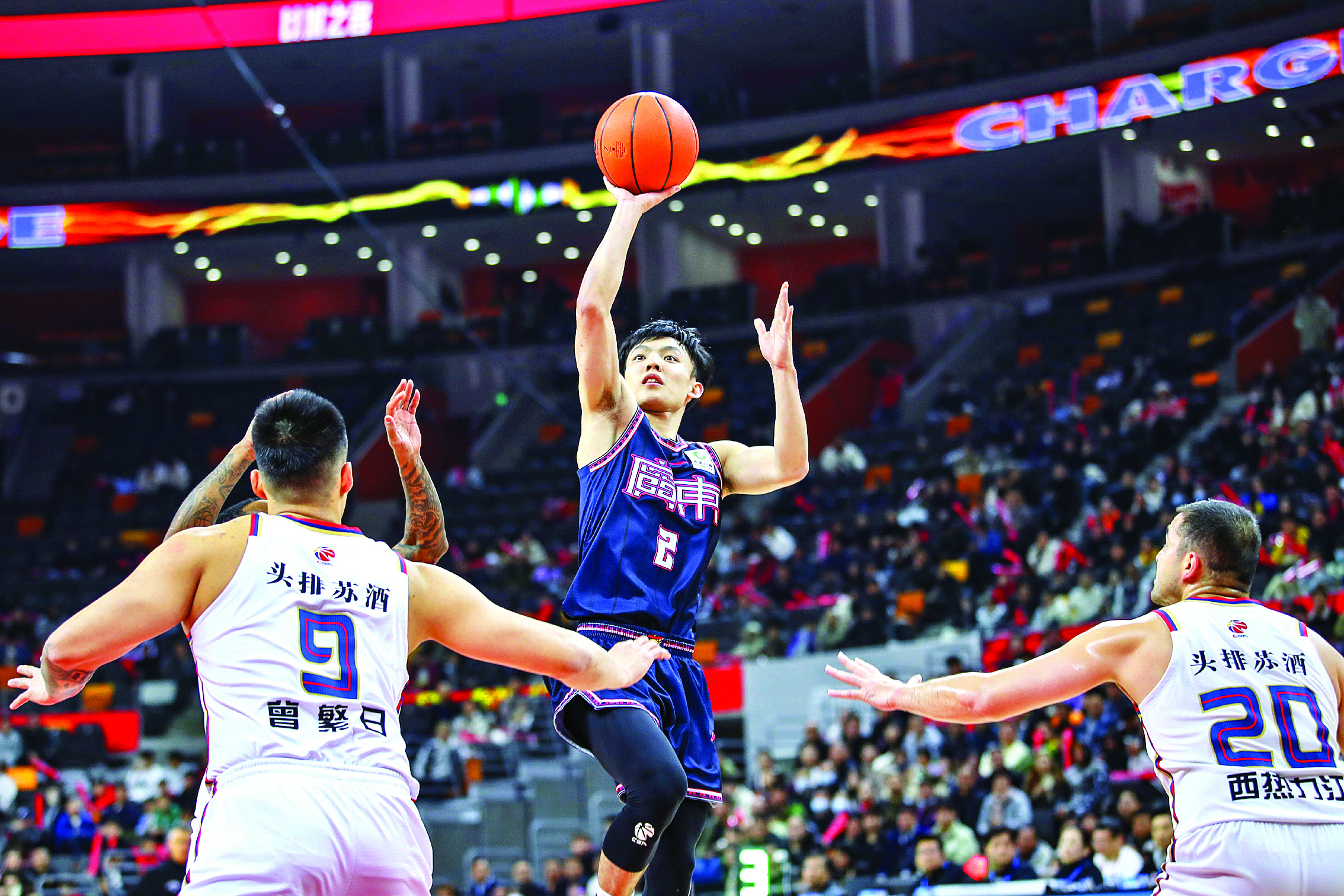 1月28日,廣東隊(duì)球員徐杰(中)在CBA常規(guī)賽比賽中投籃。 新華社發(fā)