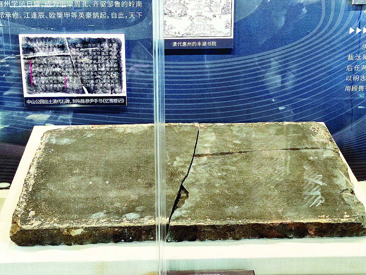 惠州千年府衙,掀開(kāi)歷史一角,隋代梌井、隋唐瓦當(dāng)、宋代東平窯陶瓷、明代白馬窯瓷器以及“府城磚”“歸善”等銘文城磚都一一出土,展示惠州悠久歷史和文化積淀。記者留意到,此次出土文物中,有一塊刻于清乾隆五十三年(1788)的“東坡先生野吏亭記”碑,碑刻背面為清康熙二十九年(1690)陳恭尹為惠州知府王煐撰并書(shū)的《憶雪樓記》(殘),一碑兩記為梌山增添歷史見(jiàn)證物。