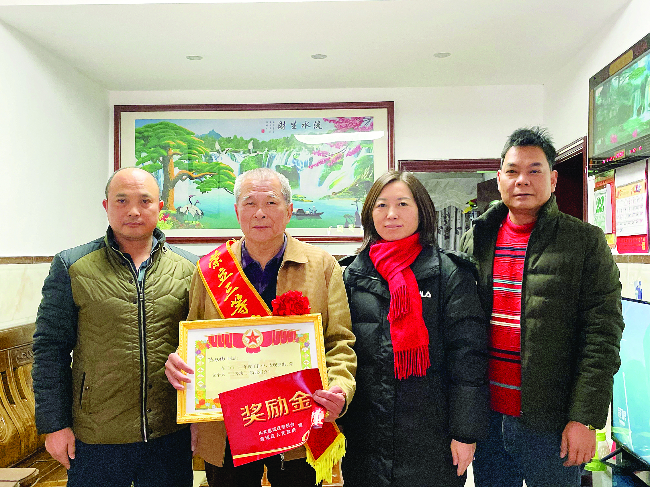 李玲(右二)為立功軍人家庭送喜報。