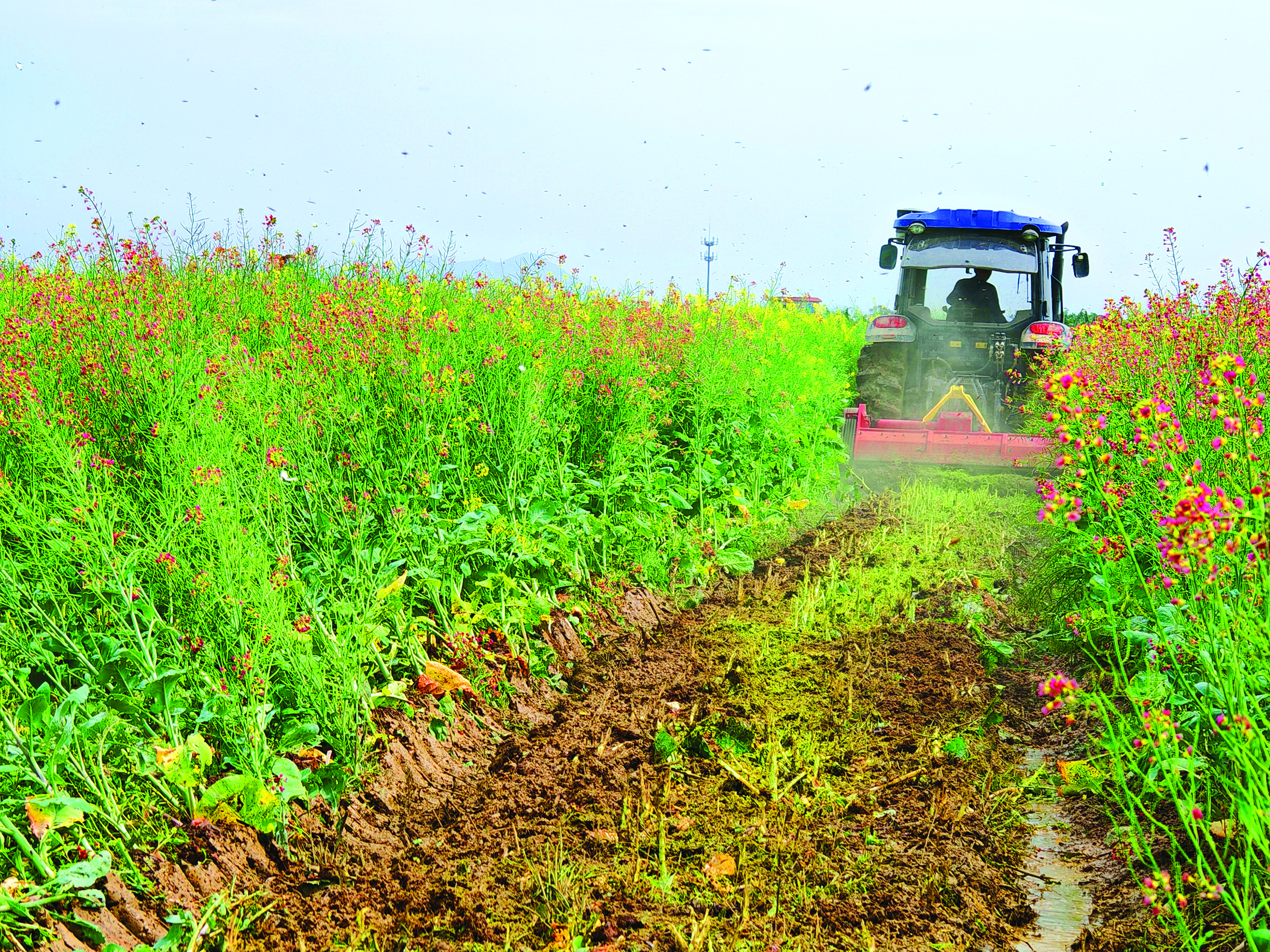 農(nóng)業(yè)機(jī)械將油菜花粉碎翻壓直接還田。