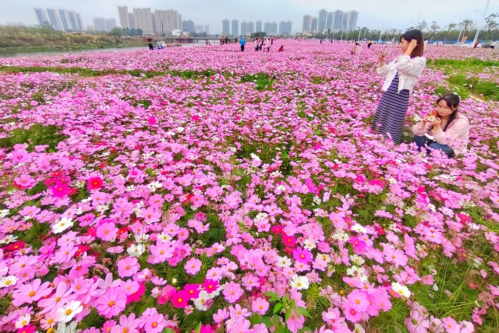 惠城區(qū)小金河大道路邊上有30畝格;ㄊ㈤_,吸引了許多游客觀賞打卡。