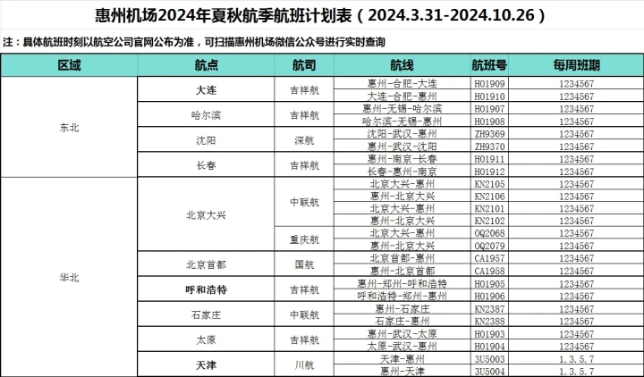 3月31日起,惠州機(jī)場(chǎng)將正式執(zhí)行2024年度夏秋航季航班計(jì)劃,執(zhí)行時(shí)間為2024年3月31日-10月26日。