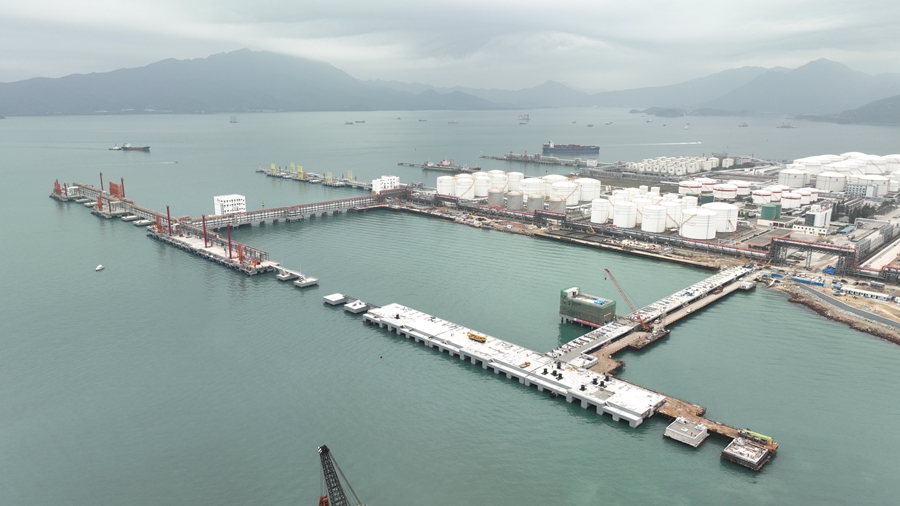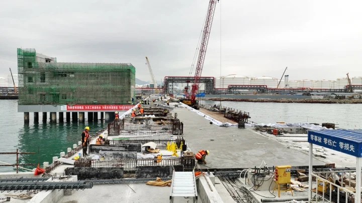 近日,記者在現(xiàn)場看到,項(xiàng)目水工平臺施工已近尾聲,綜合樓、設(shè)備用房等也在緊張施工中。華學(xué)輝介紹,項(xiàng)目分為兩個(gè)標(biāo)段建設(shè),其中,水工施工標(biāo)段形象進(jìn)度已完成96%,正在進(jìn)行疏浚工程、上部結(jié)構(gòu)工程、停靠船與防護(hù)設(shè)施工程及海水泵房工程施工;包括綜合樓、設(shè)備用房基礎(chǔ)及擋浪墻與護(hù)岸施工等在內(nèi)的安裝工程標(biāo)段,形象進(jìn)度已完成7%,項(xiàng)目施工總形象進(jìn)度已完成67%,按計(jì)劃將在今年底建成。屆時(shí),原材料運(yùn)到惠州港后將在碼頭接卸,并通過公共管廊運(yùn)到庫區(qū)儲存。
